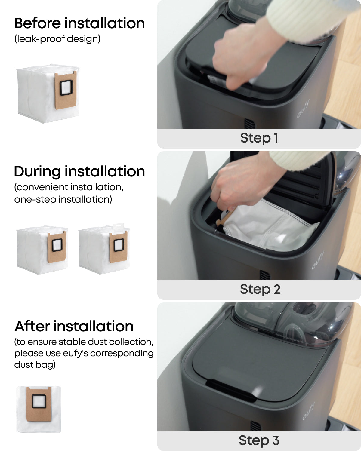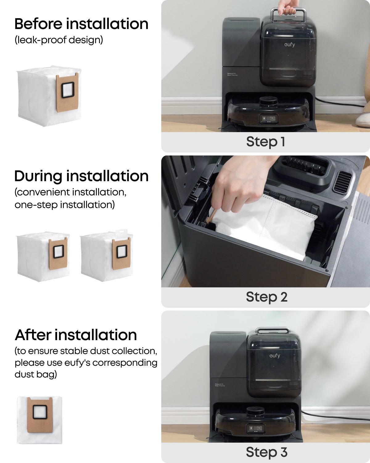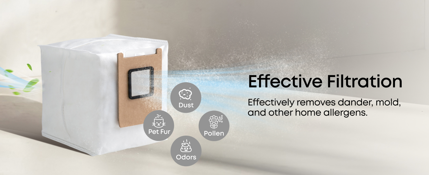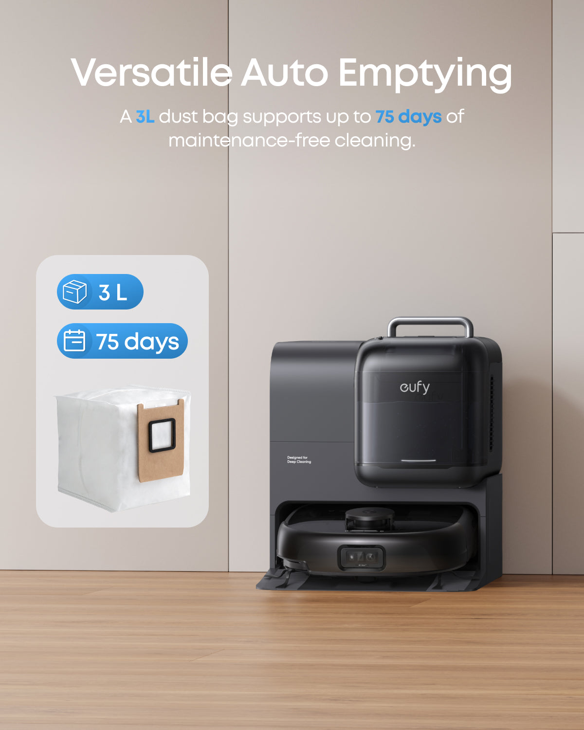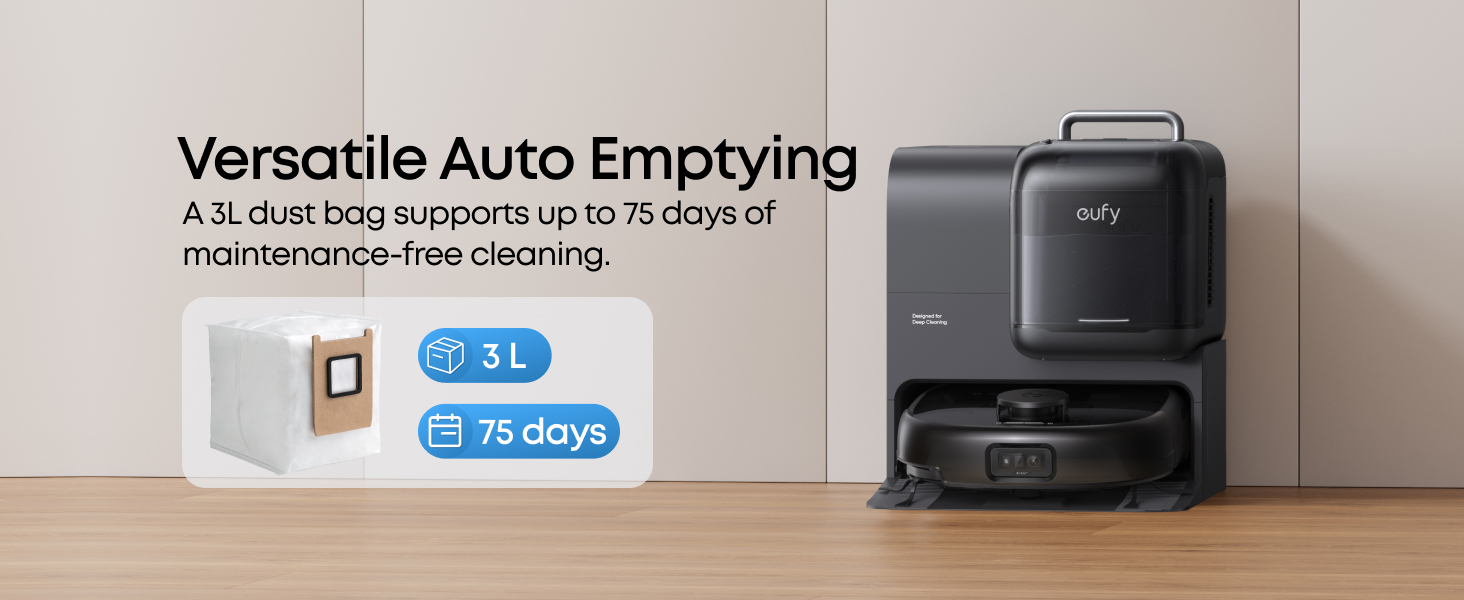• Versatile auto emptying: With a spacious 3L dust bag, enjoy up to 75 days of hands-free cleaning. The 3-pack replacement set ensures long-term maintenance convenience