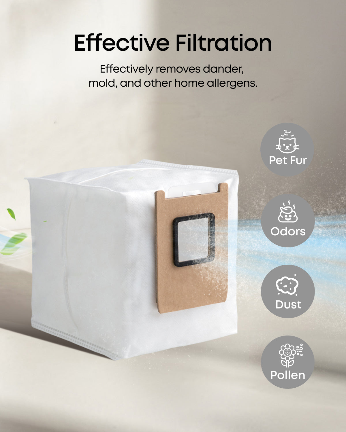 • Effective filtration: Efficiently filters dander, mold, and other common household allergens, promoting healthier indoor air quality