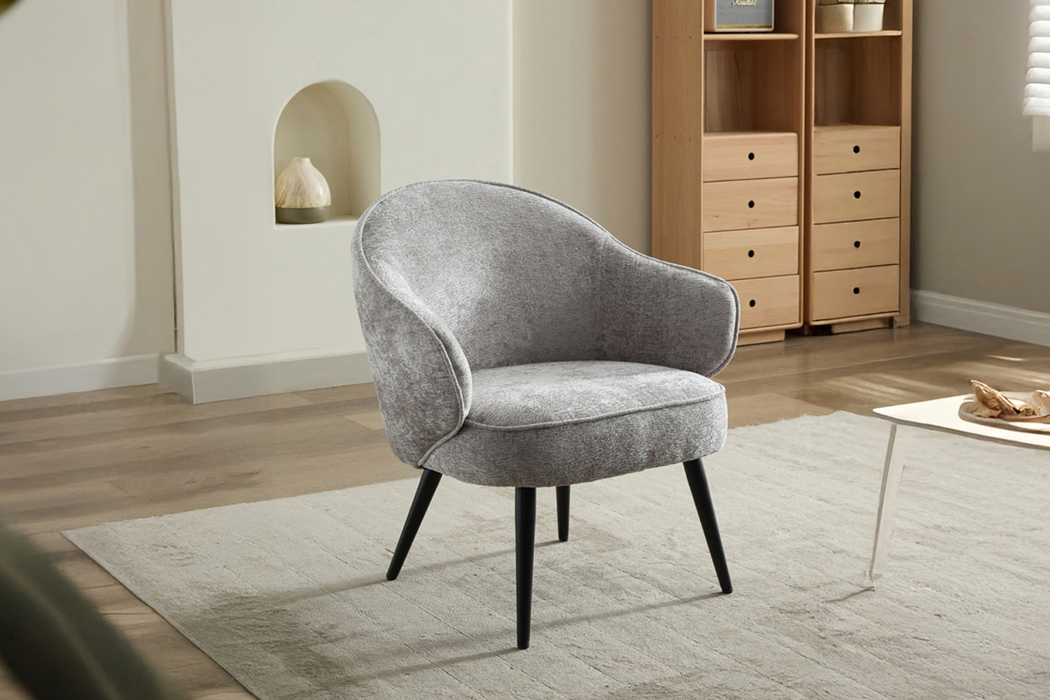 The perfect focal point that will tie any room together, the Morgan Accent Chair evokes a feeling of warmth and comfort. Sink into its inviting embrace, thanks to seat and back cushions filled with a blend of plush foam and fibre. Harmoniously blending fashion and durability, this chair is crafted from wood and rests upon slim black, metal tapered legs that contrast and complement the neutral fabric upholstery. The bucket-seat shaped design offers an inviting and supportive sit making it a chic and cosy addition to any space that values both relaxation and aesthetic appeal. Available in multiple sizes.