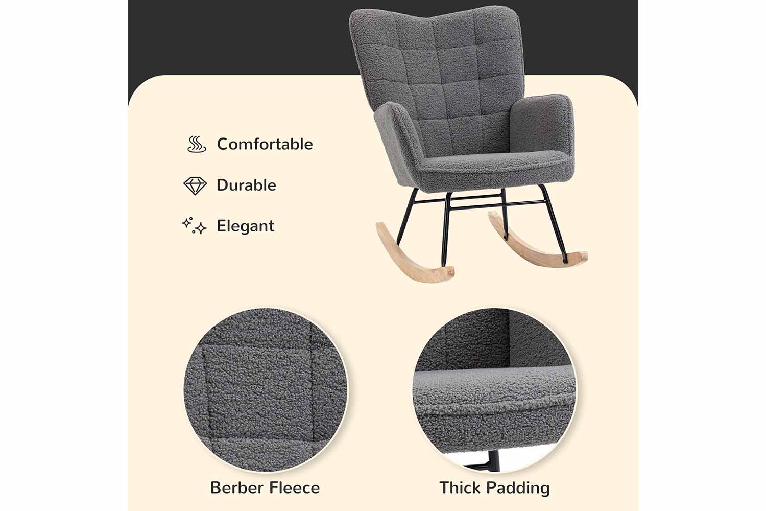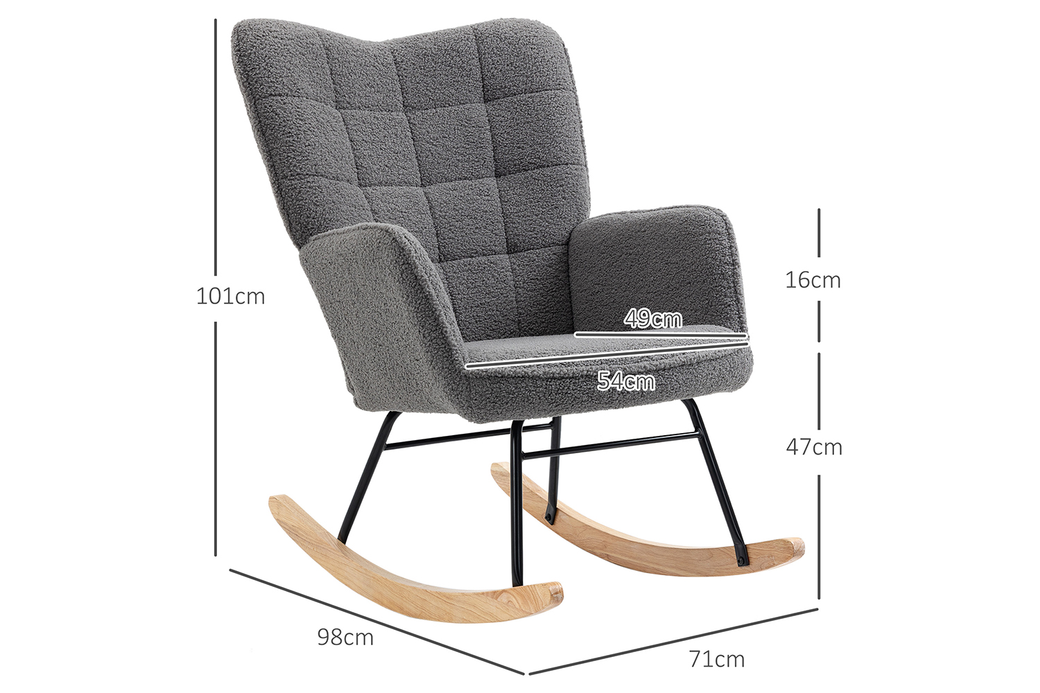 Soft, rocking and spacious - take time out in comfort with this Homcom rocking chair. The wingback shape comes in a large size, so there's plenty of room to sink into, with a padded seat for comfort and high back and armrests for support. Metal legs for support, fitted with a curved wooden base - rock forwards and backwards gently. Finished with fleecy upholstery, adding to the overall softness and comfort.