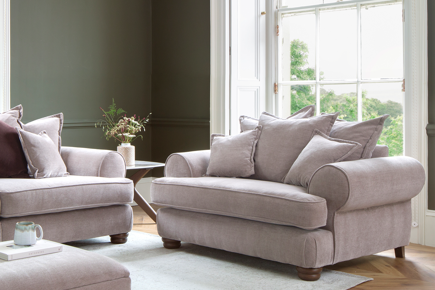 Treat you and your home to the exquisite Charlotte Love Seat. Boasting impeccable design, this sofa includes feather filled scatter back cushions for you to sink into after and long hard day. Really make this piece your own by choosing from a wide range of colours and soft fabrics. This look is complete with the walnut wooden feet giving this sofa that classic finish.