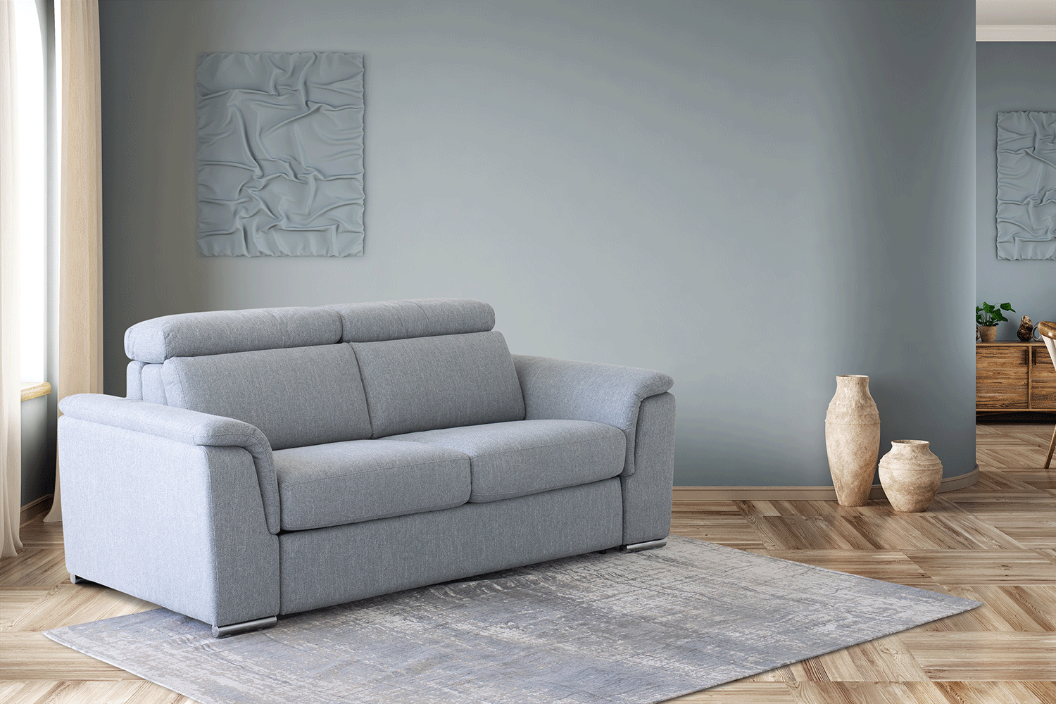 As if the intricate visual features of this sofa weren’t enough to catch your eye, its hidden functions are sure to turn your head. Adjustable headrests allow for custom comfort while the pull-out sofa bed is ideal for any visitors.