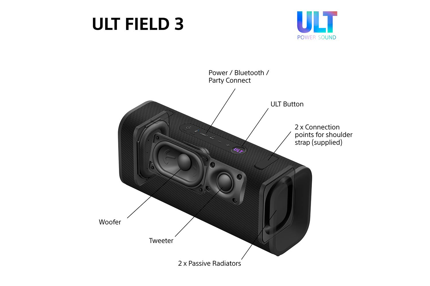 Introducing the ULT FIELD 3: Delivering impactful, room-filling sound from a portable design, the powerful woofer combines with a high-quality tweeter and two passive radiators to produce rich, detailed audio with a satisfying punch. Tailor the sound to your liking with the Sony | Sound Connect app's 7-band equaliser.