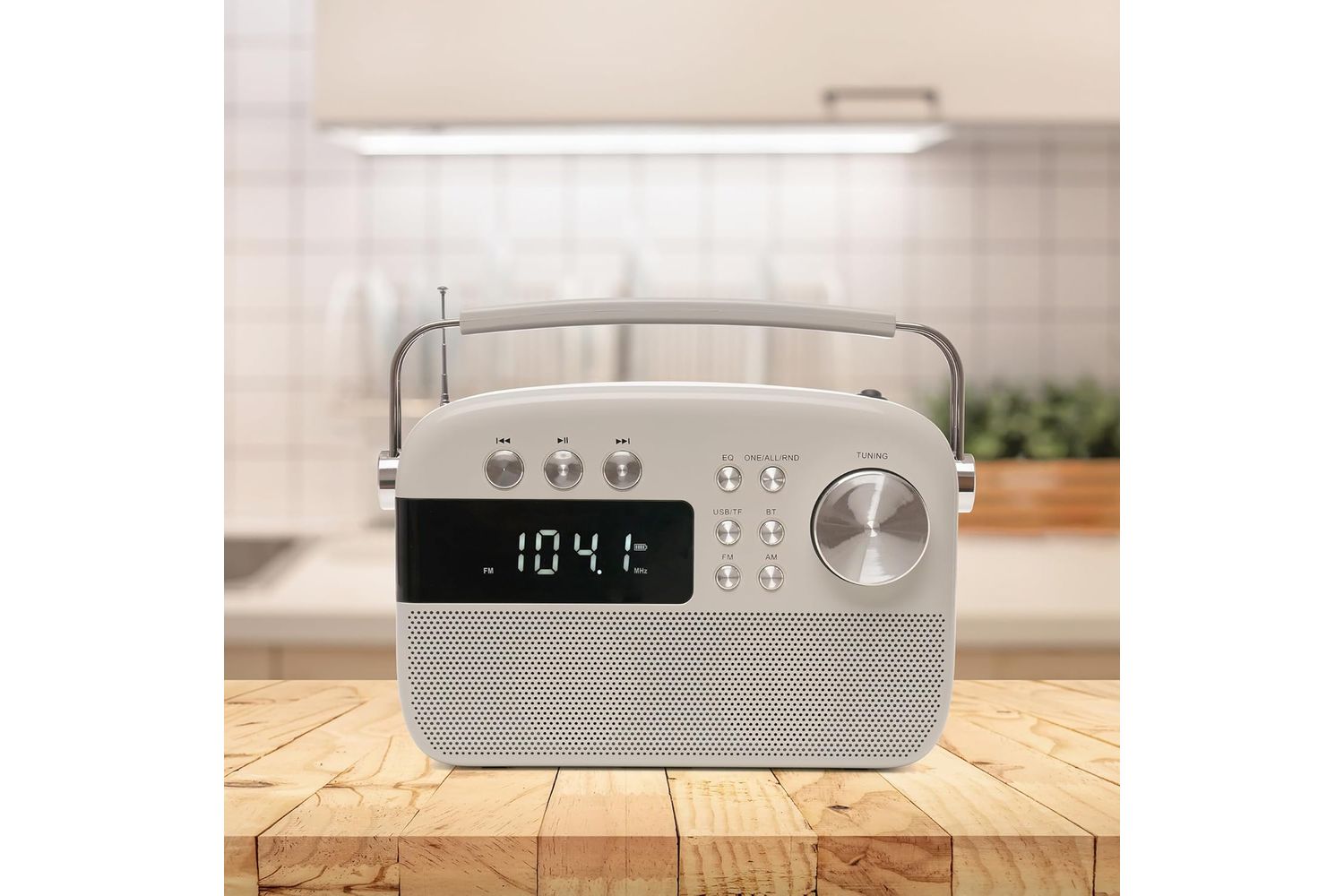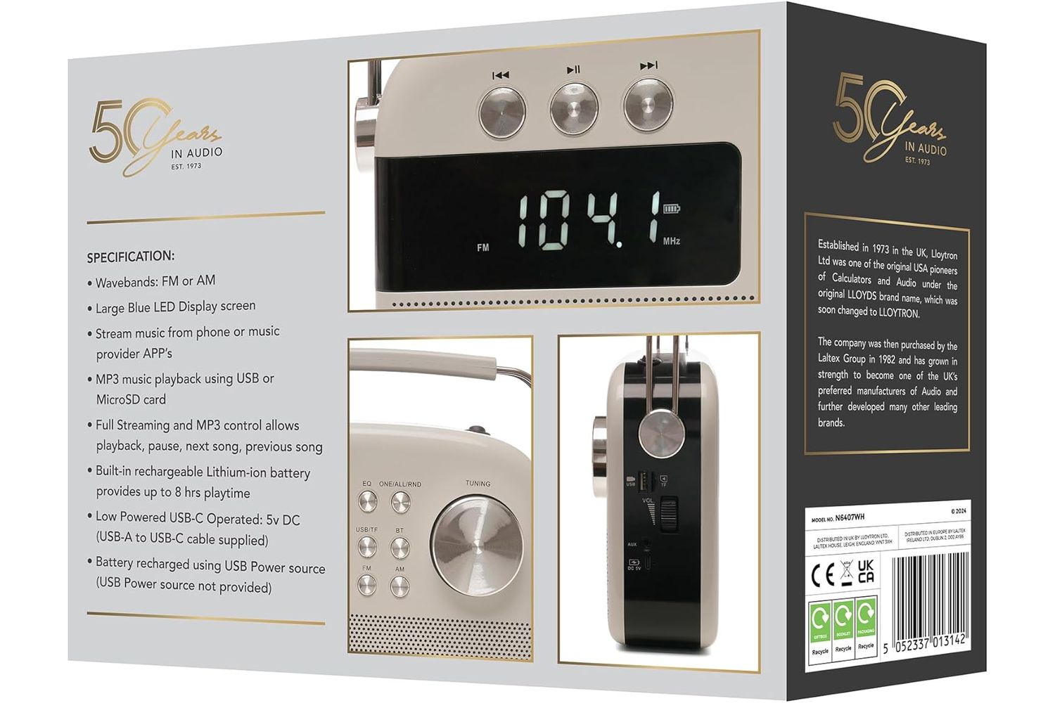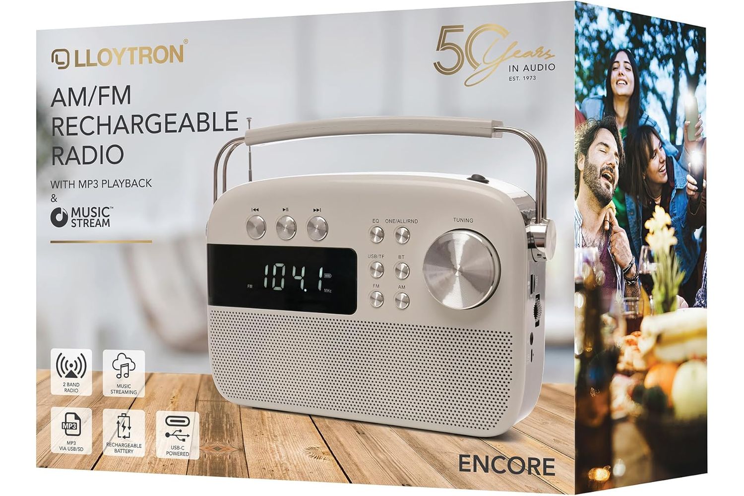 Lloytron 2 Band Encore Rechargeable Portable Radio MusicStream. Combining vintage style with high-quality sound and cutting-edge features, this portable radio lets you enjoy your favourite tunes, shows and more wherever you go. Based on the latest retro-look yet embracing current listening trends, this device caters to every music lover, offering AM/FM tuning, Bluetooth streaming, MP3 playback, and more in one sleek unit.