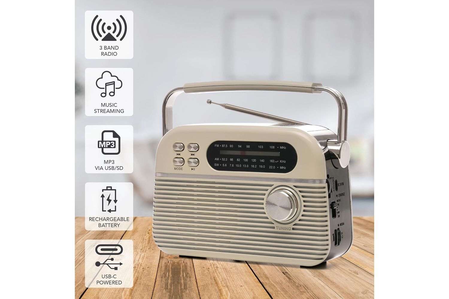 Experience a blend of classic style and modern convenience with the Lloytron 3 Band Bolero Rechargeable Portable Radio MusicStream. Perfectly suiting Irish radio lovers, this little gem brings a plethora of radio stations on its table. Effortlessly tune into your favourite local FM stations, investigate engaging AM talk shows, or explore the exotic appeal of shortwave broadcasts without the need for an internet connection.