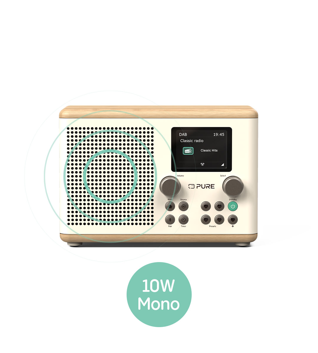 This digital radio features a strong mono speaker delivering 10 watts, driven by a 3" full-range driver. Enjoy clear, great-sounding audio every day.
