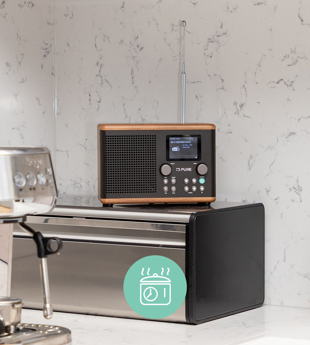 Designed in the UK to seamlessly blend into your kitchen decor, the Classic H4 is available in Cotton White/Oak or Coffee Black/Walnut options. Its compact size with 20cm in width (a standard pencil) ensures it fits effortlessly into any space, while the intuitive 2.4” colour TFT display makes navigation a breeze. Whether adjusting settings or browsing stations, control is always at your fingertips.