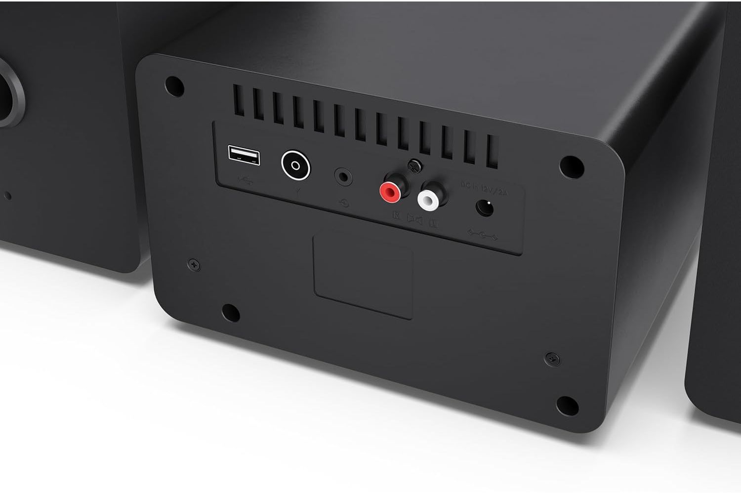 Sporting Bluetooth V5.0, your smartphone or tablet initiates mundane free wireless music streaming directly to the micro system in a snap. The inclusive headphone jack places private, late-night jamming sessions.