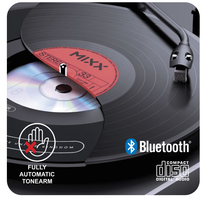 Reignite your love for physical media with the Mixx Analog Plus, a fully integrated music system that blends vintage charm with modern technology. Designed for both vinyl enthusiasts and CD collectors, the Analog Plus features a fully automatic turntable and built-in CD player, delivering rich, immersive sound in a compact, stylish unit. Experience true convenience with fully automatic tonearm control, allowing you to play, pause, skip, or stop records at the touch of a button. Choose between 33 or 45 RPM and select 12" or 7" records for smooth playback of albums and singles. With auto speed control, skip forward/backward, and repeat functions, the Analog Plus lets you enjoy your vinyl collection exactly how you want. The integrated CD player includes full track number and time display, giving you the info you need at a glance. Use the included IR remote to take full control of both the turntable and CD functions from anywhere in the room. Need flexibility? Stream your music wirelessly to your favourite Bluetooth speakers or headphones using the built-in Bluetooth transmitter. Prefer a wired setup? Use the AUX out connection to plug directly into your home sound system. The Mixx Analog Plus isn't just about nostalgia - it's about delivering a premium, user-friendly listening experience. From the comfort of remote operation to the joy of hearing your favourite albums on vinyl or CD, this all-in-one solution brings analogue and digital audio together with effortless style.