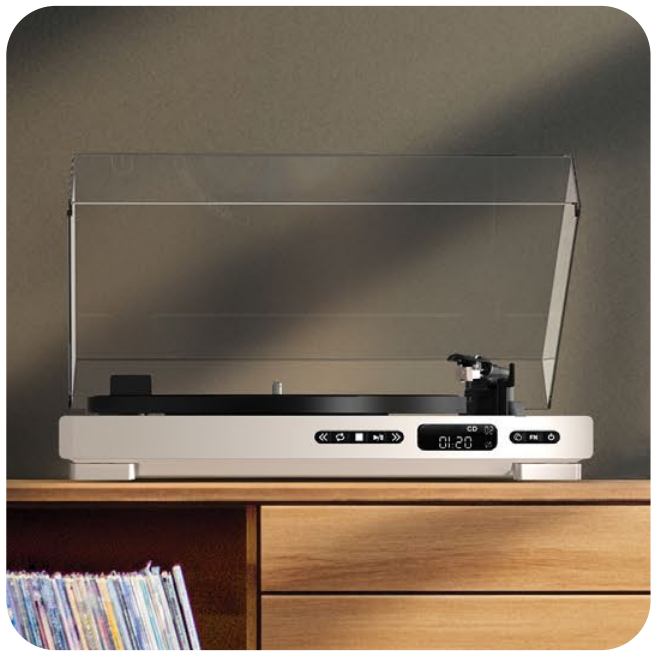 Enjoy effortless vinyl listening with automatic tonearm control, skip, repeat, and stop functions - no manual adjustments required. Play your favourite CDs with full track number and time info clearly shown on the display for easy navigation and playback control.