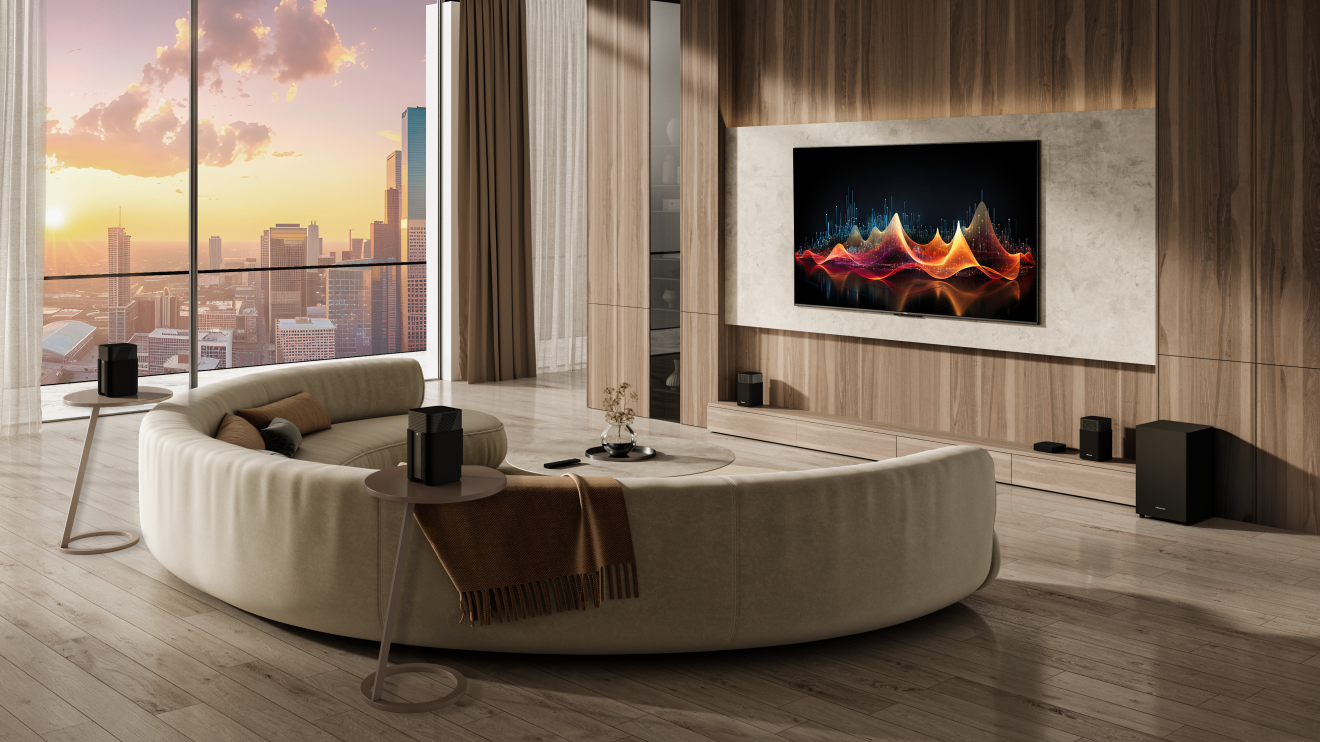 A Home Theater System designed to blend seamlessly into your come,with wireless speakers that can be wall-mounted or free-standing.