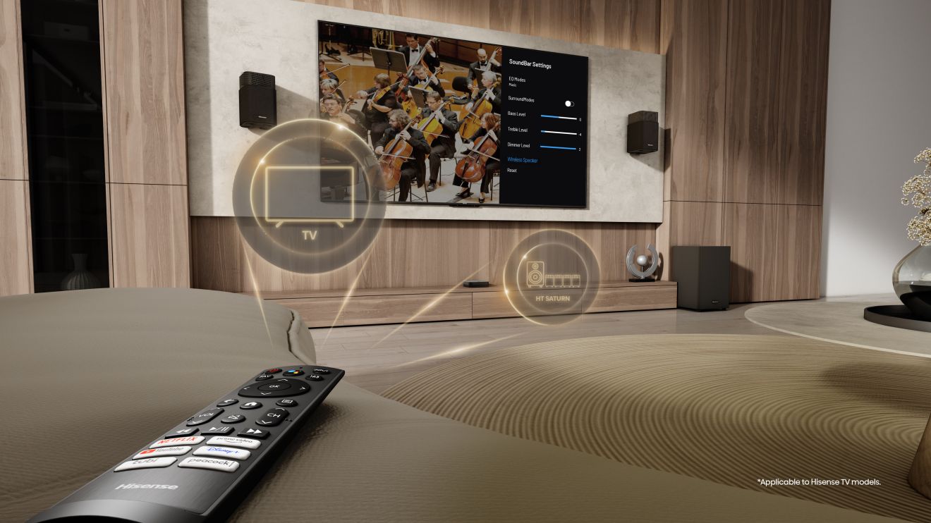 Experience enhanced surround sound with HT Saturn and TV working together, utilizing all available speakers simultaneously to expand the sound field and deliver a truly immersive audio experience. Hi-Concerto only works with select Hisense TV Models.