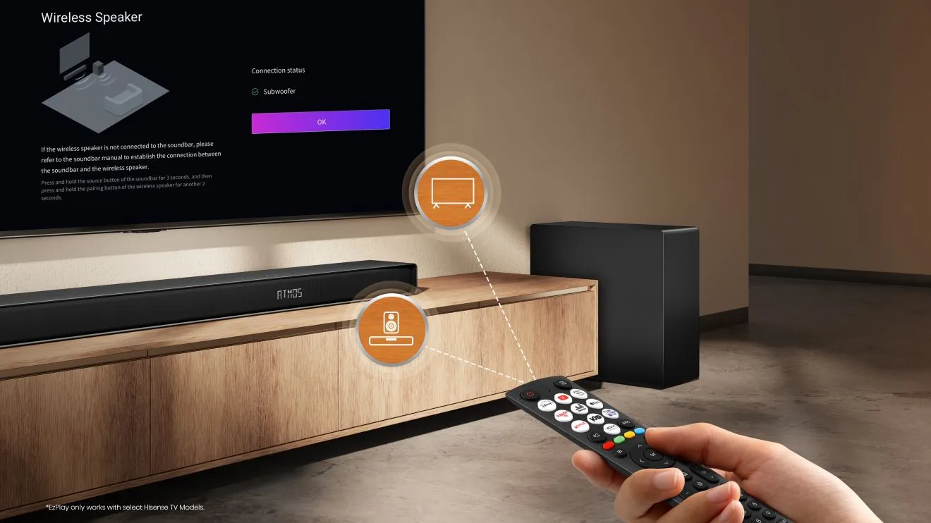 Easily control your Hisense Soundbar's sound modes through your Hisense TV remote to optimize audio and dialogue. Thanks to EzPlay 3.0, real-time wireless speaker status is displayed on your TV for seamless control.*EzPlay only works with select Hisense TV Models.