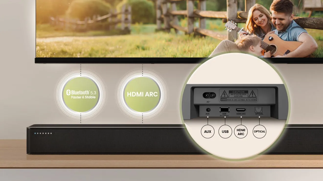 Hisense supports Bluetooth 5.3, Faster & Stable, HDMI ARC, AUX, USB, HDMI ARC, &and OPTICAL.