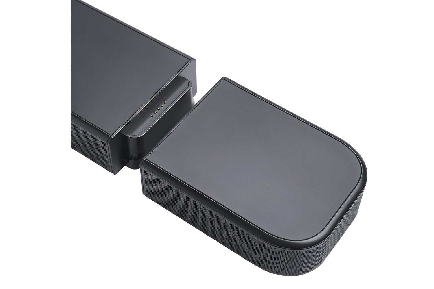 It's never been easier to jump into true surround sound. No extra wires. No power connections. Just lift the detachable surround speakers off the soundbar—you can do it with just one hand—and place them behind you in the room for true surround sound. It's that simple. Whether you're binge-watching your new favorite show or hosting a movie night, the speakers' long-lasting batteries mean you'll enjoy immersive, cinematic surround sound for hours. When you’re done, simply place them back on the soundbar to charge overnight.