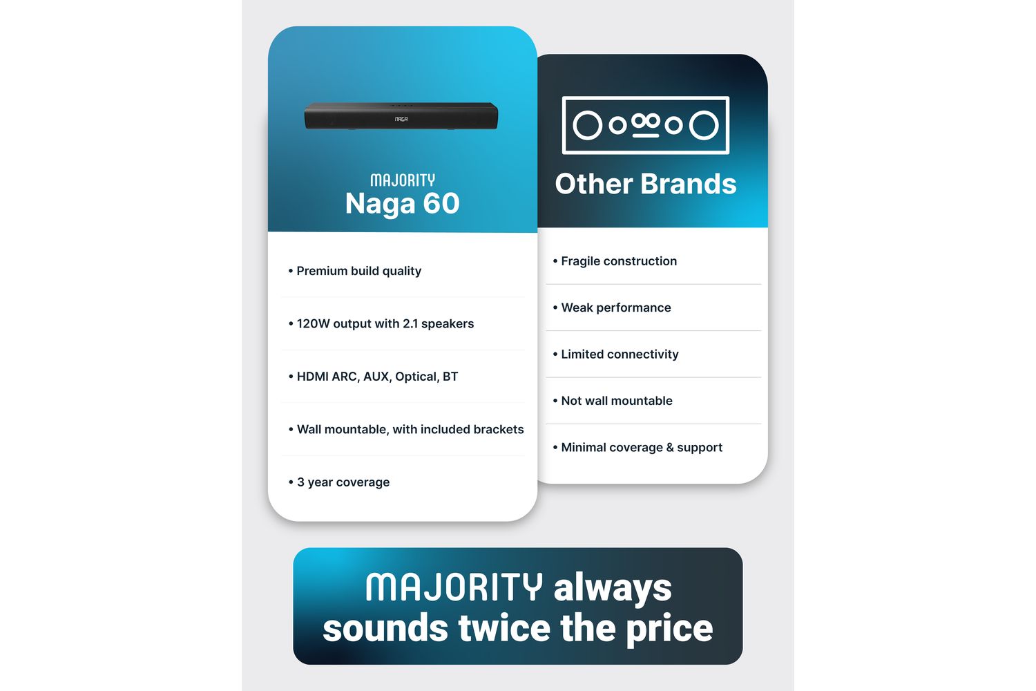 Unleash exceptional audio quality in your home with the Majority Naga 60 Soundbar . Tailored especially for the true audio enthusiast, this remarkable soundbar transforms your TV and music listening experience into an auditory pleasure like no other.