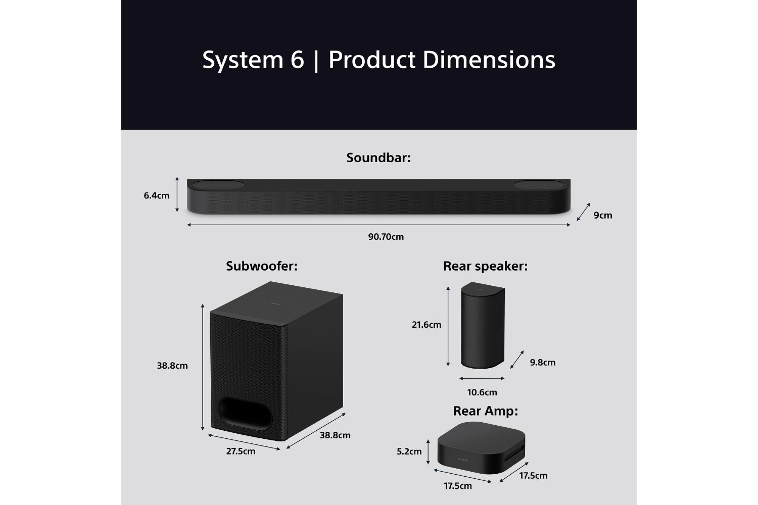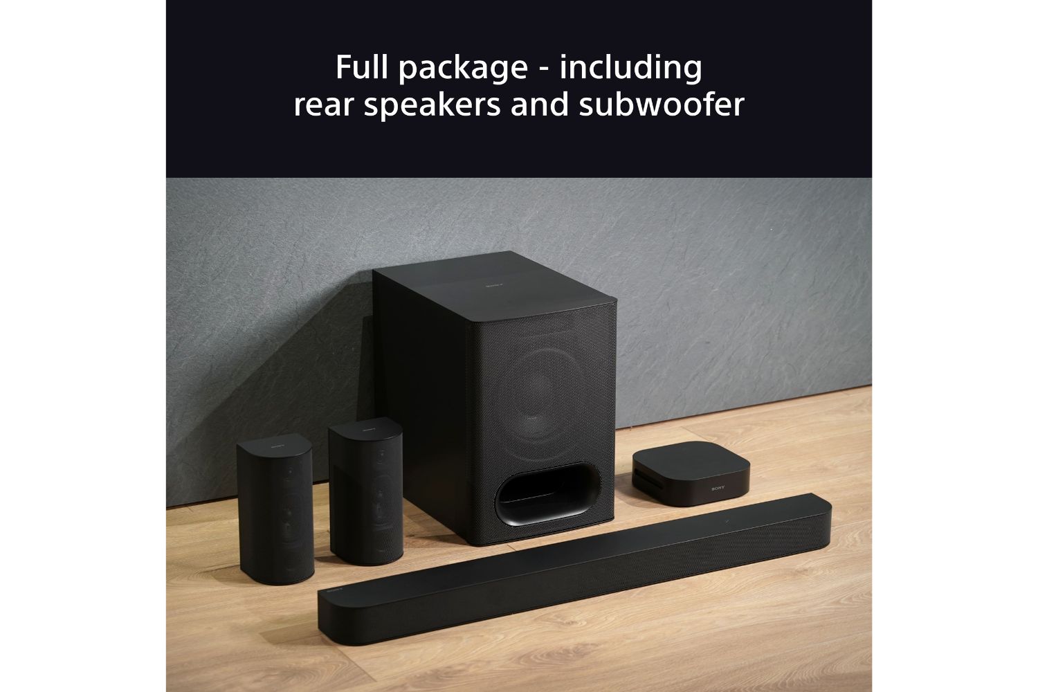 Stand or mount them—your soundbar, rear speakers, and control box fit your space, your way.