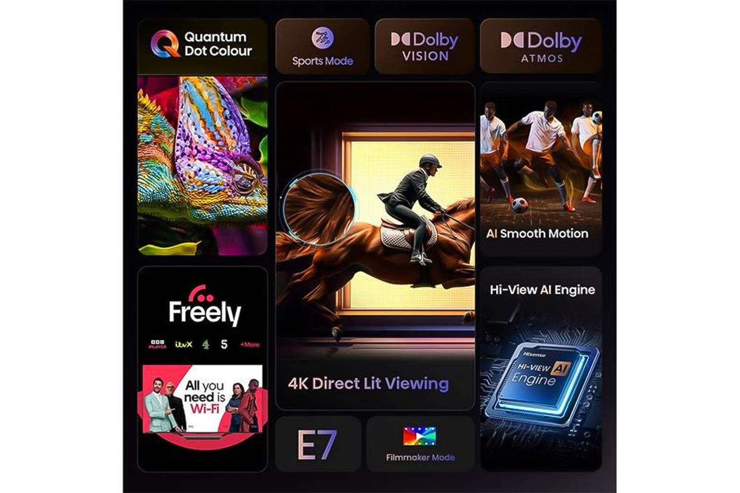 Over a billion shades are brought to life with Quantum dot colour on this Hisense E7Q 55" TV. It's not just vibrant, colours are served up in a true and natural way. The directlit full array display precisely controls the contrast and brightness. That means deep blacks and bright highlights from edge to edge that are always on point. The Hi-view engine uses AI to boost the picture frame by frame – even older content gets an upgrade. And Dolby Atmos has you covered for sound. It creates a virtual surround sound experience that makes you feel like you're right where the action is.