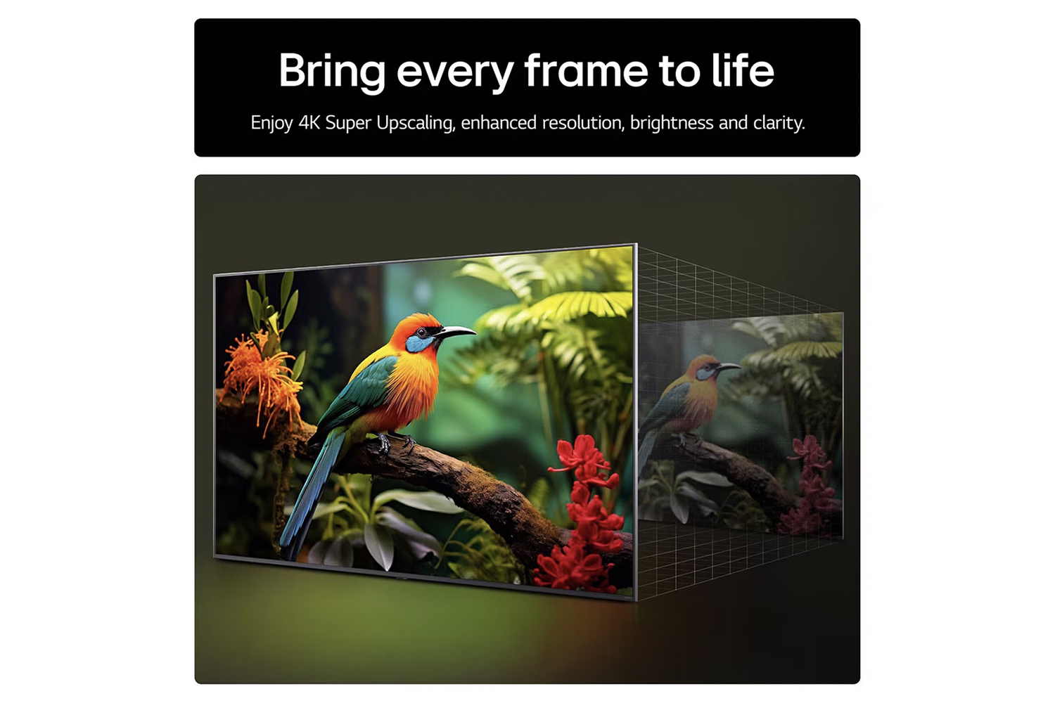 LG's powerful processor boosts the resolution to the original quality. Enjoy 4K Super Upscaling enhanced resolution, brightness, and clarity.