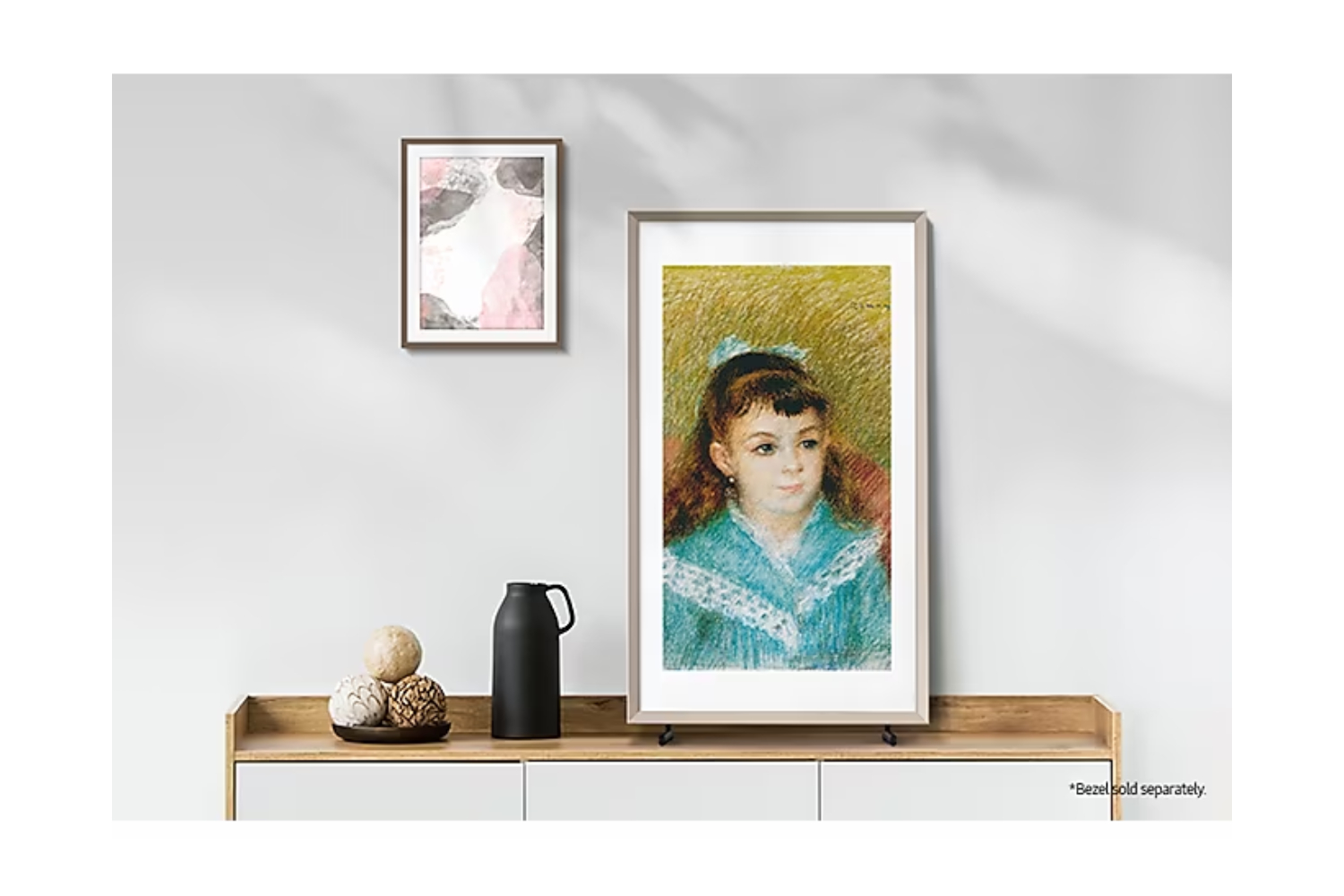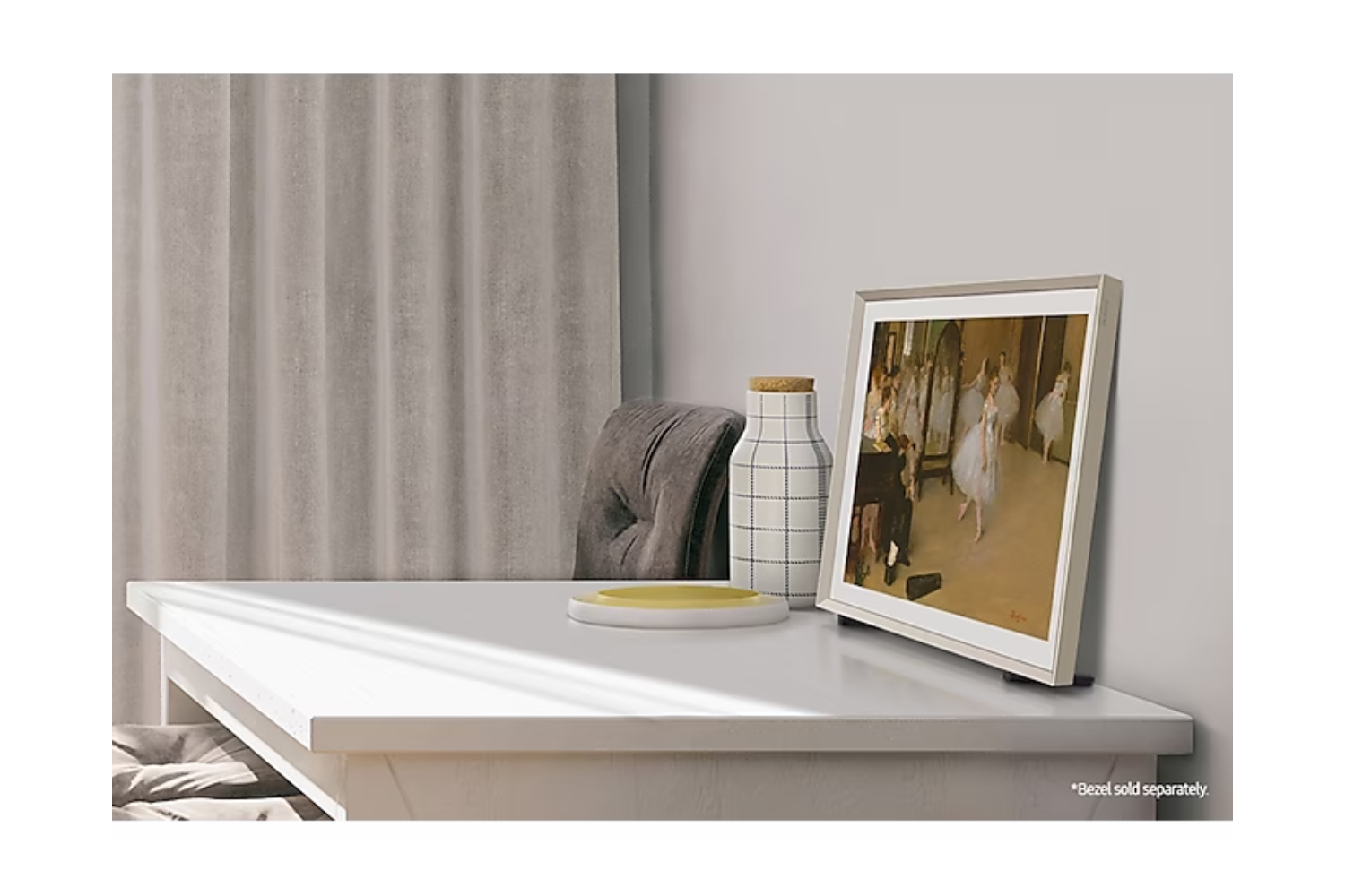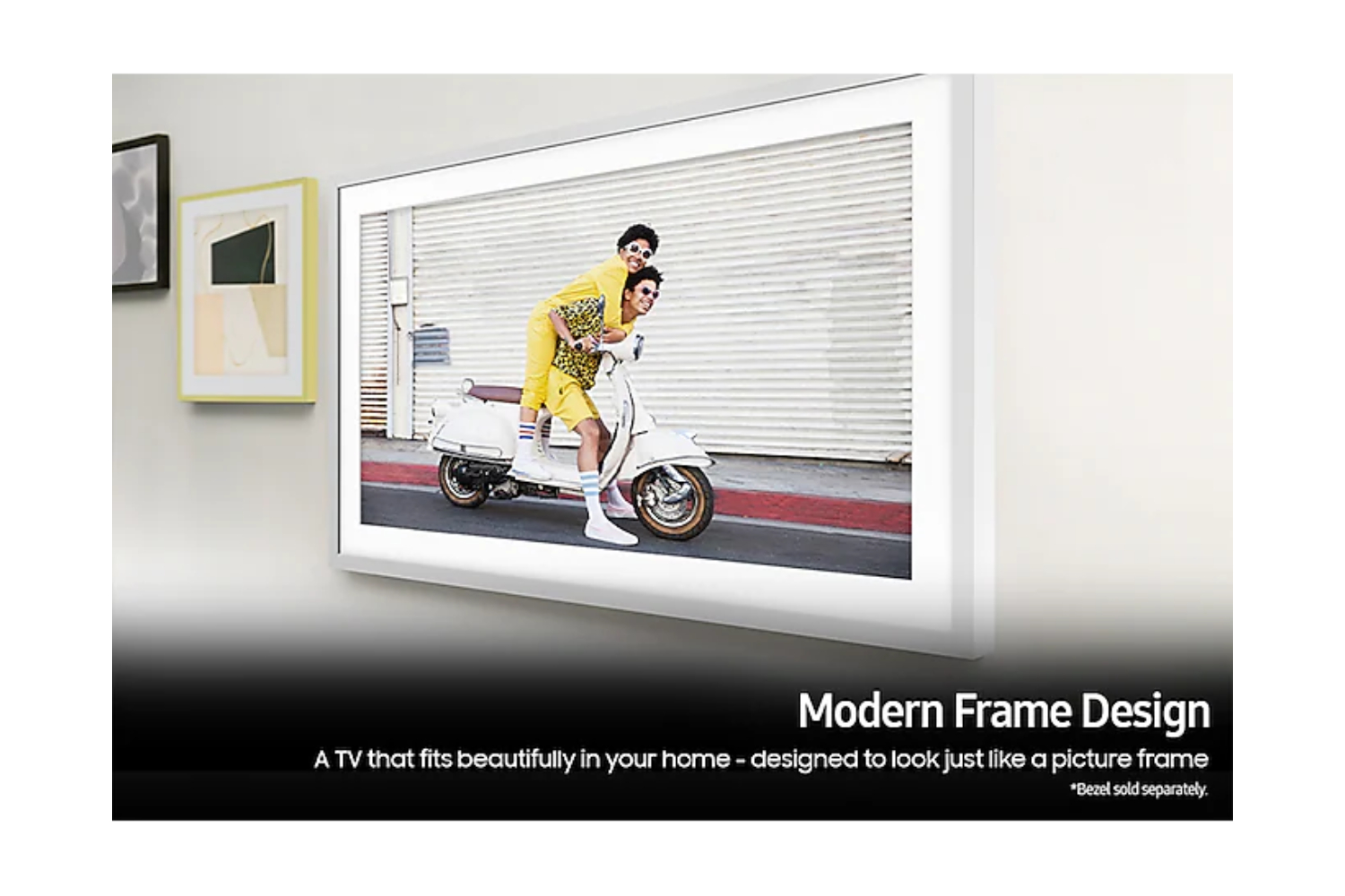 Instead of turning into a black screen, The Frame transforms into a showcase of beautiful artwork and photography when it's turned off, allowing the TV to become part of your décor. Enjoy your favourite pieces for as long and as often as you like with no screen burn worries – guaranteed**.*Bezel sold separately.