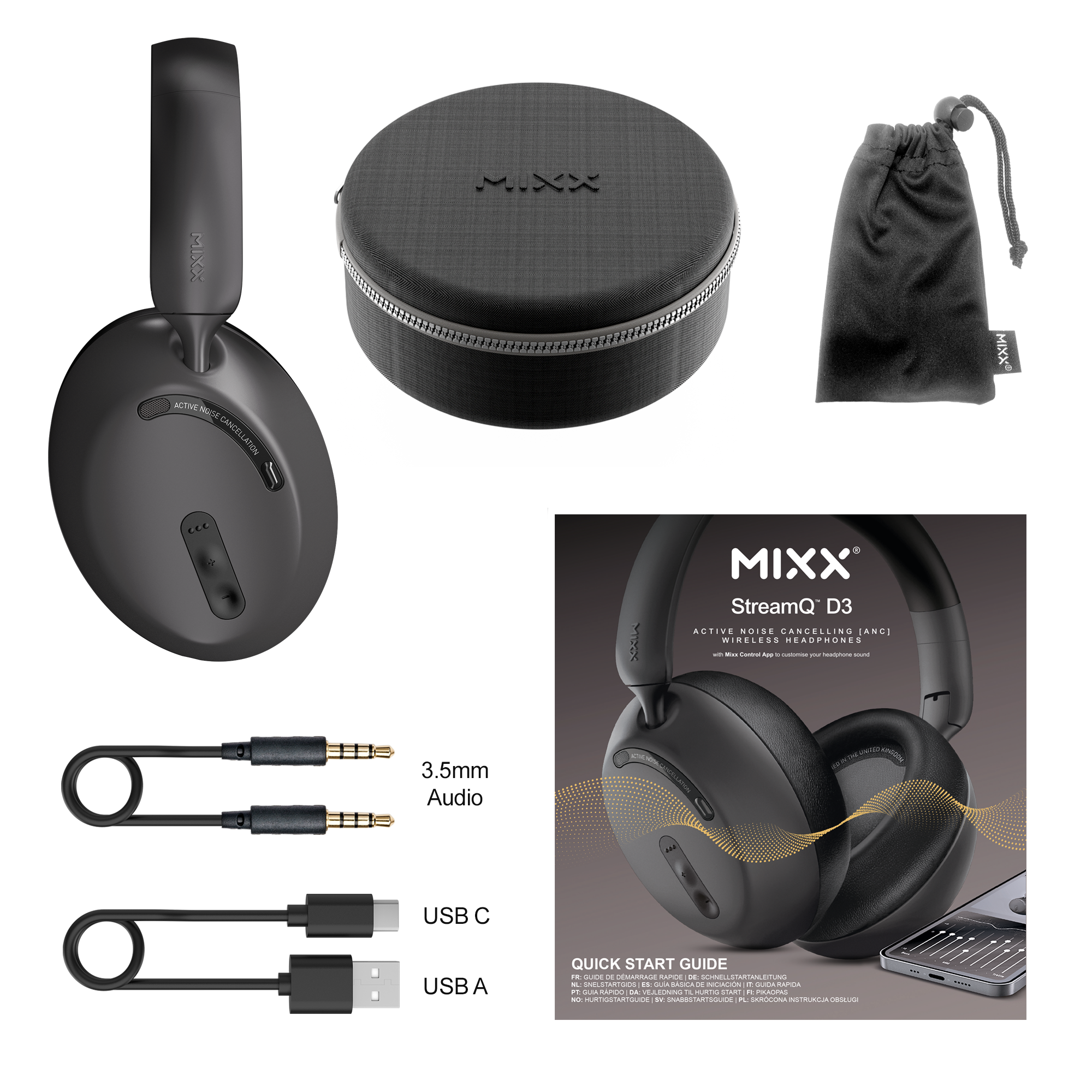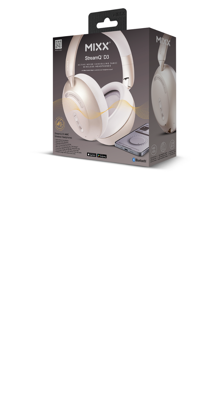 The lightweight, foldable design with deluxe carry case, ensures easy portability, while the included 3.5mm audio cable offers a wired listening option when needed. The MIXX Control App enhances your experience by enabling you to customise EQ settings and control ANC modes to suit your preferences. Whether you’re working, traveling, or relaxing, the MIXX StreamQ D3 ANC Headphones deliver unparalleled audio quality and convenience.