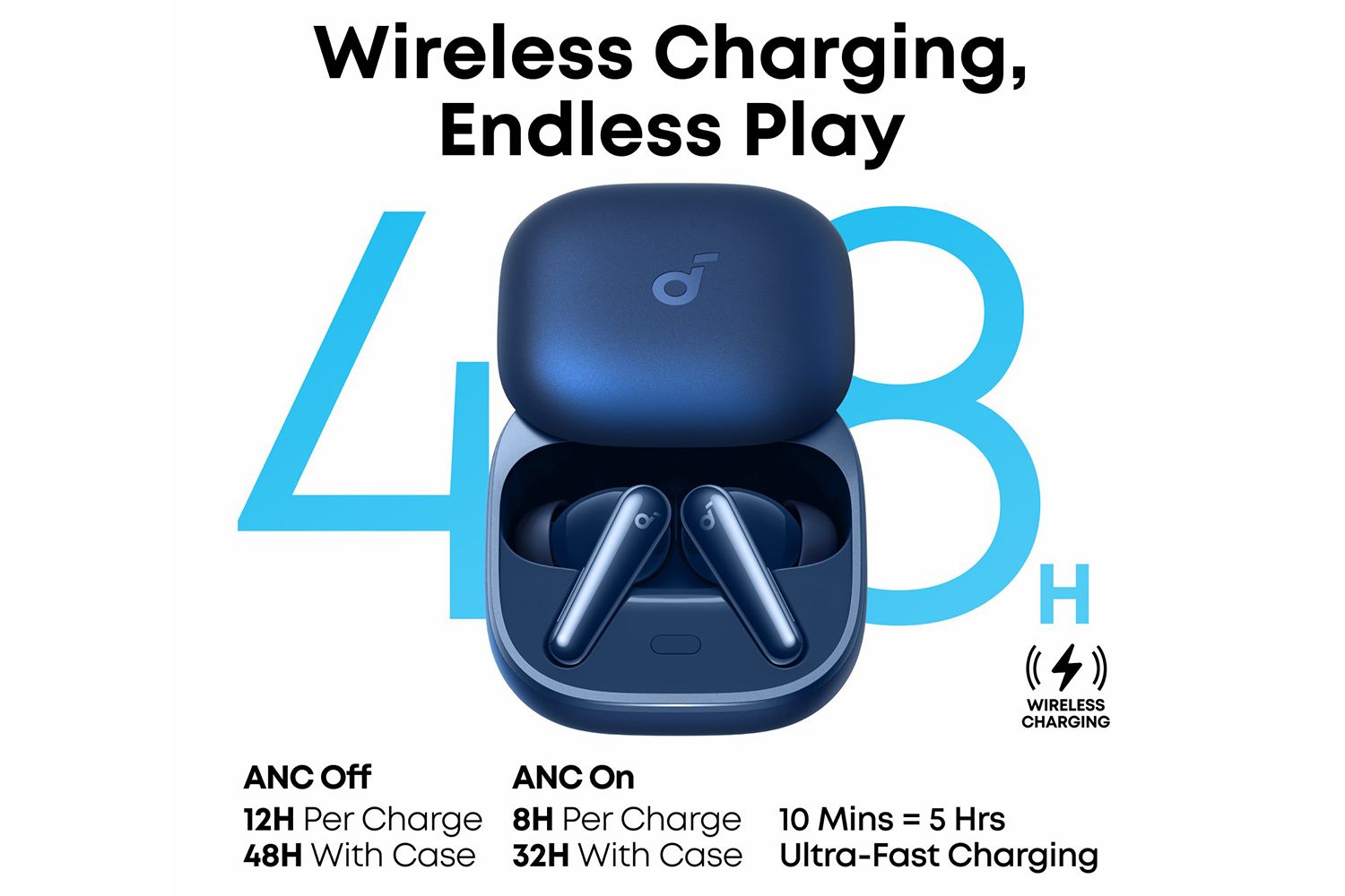 • 12H/48H ANC Off, 8H/32H ANC On: A 10-minute charge gives you another 5 hours.