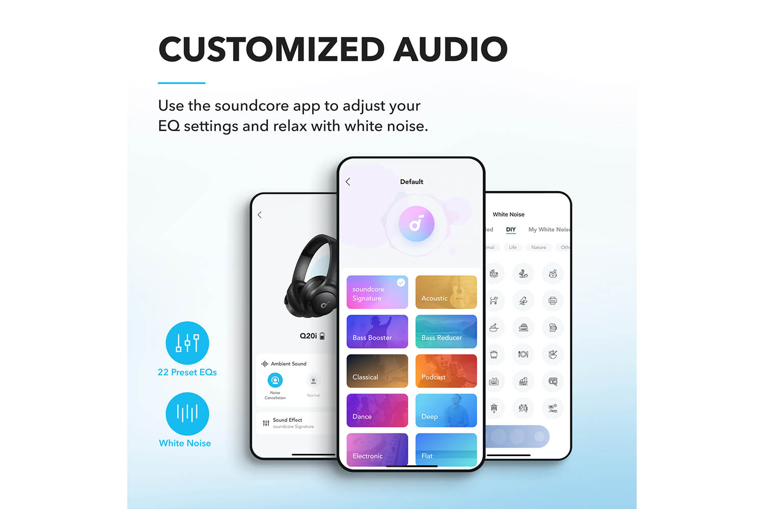 Download the soundcore app to tailor your sound using the customizable EQ, with 22 presets, or adjust it yourself. You can also switch between 3 modes: ANC, Normal, and Transparency, and relax with white noise.