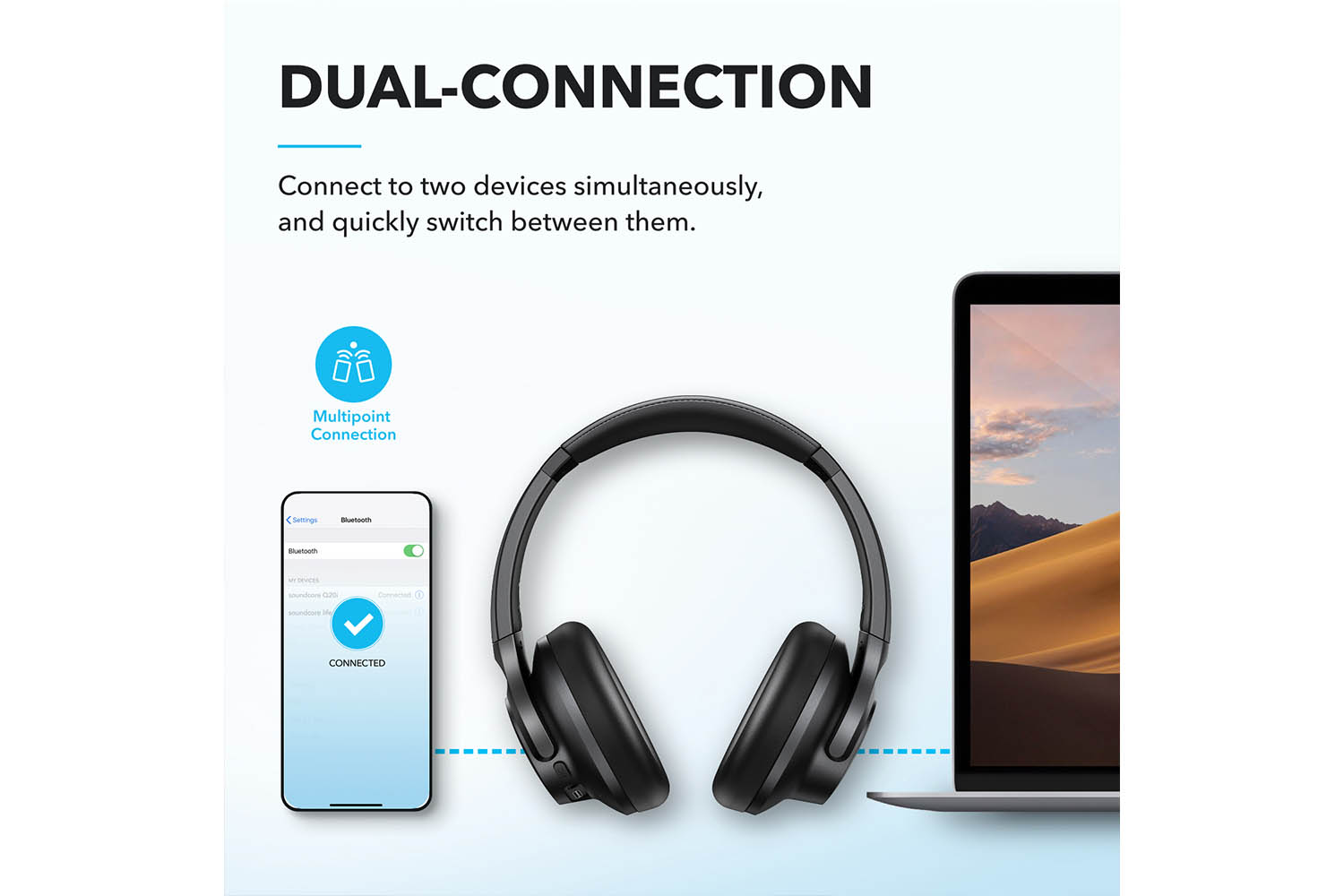 Connect to two devices simultaneously with Bluetooth 5.0 and instantly switch between them. Whether you're working on your laptop, or need to take a phone call, audio will automatically play from the device you need to hear from.