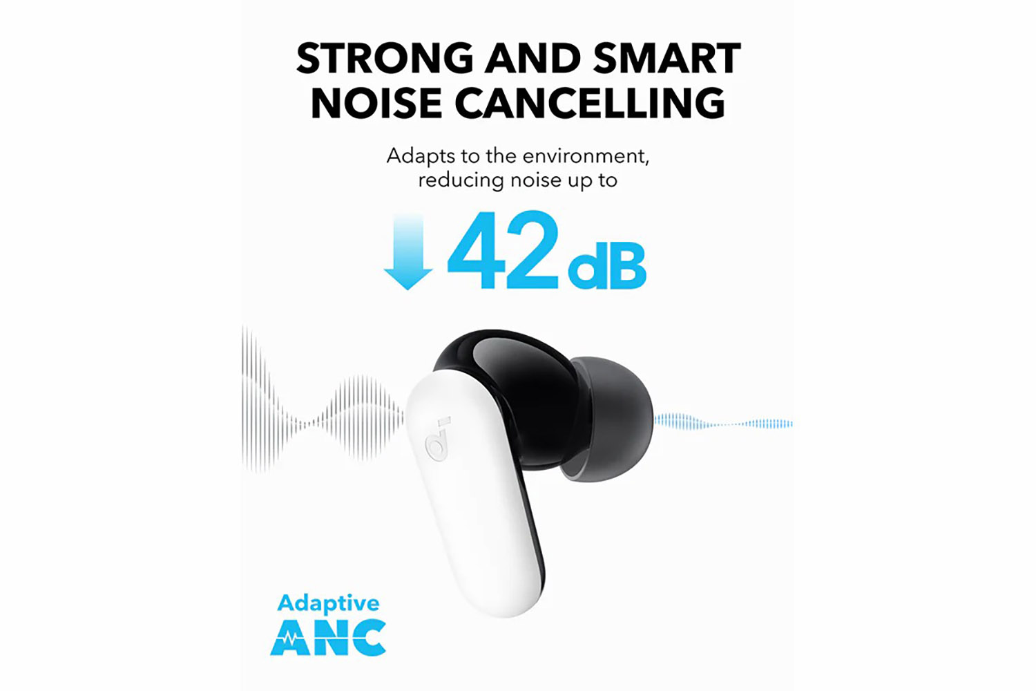Reduce noise by up to 42dB with an advanced active noise cancelling system. With adaptive technology, soundocre R50i NC detects external sound and automatically selects a level of noise cancelling optimized for your ears.