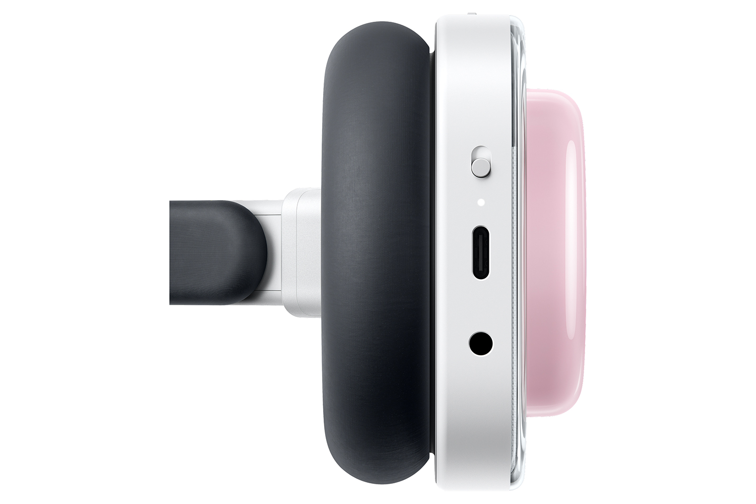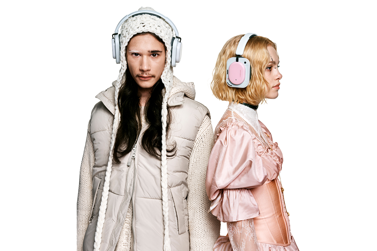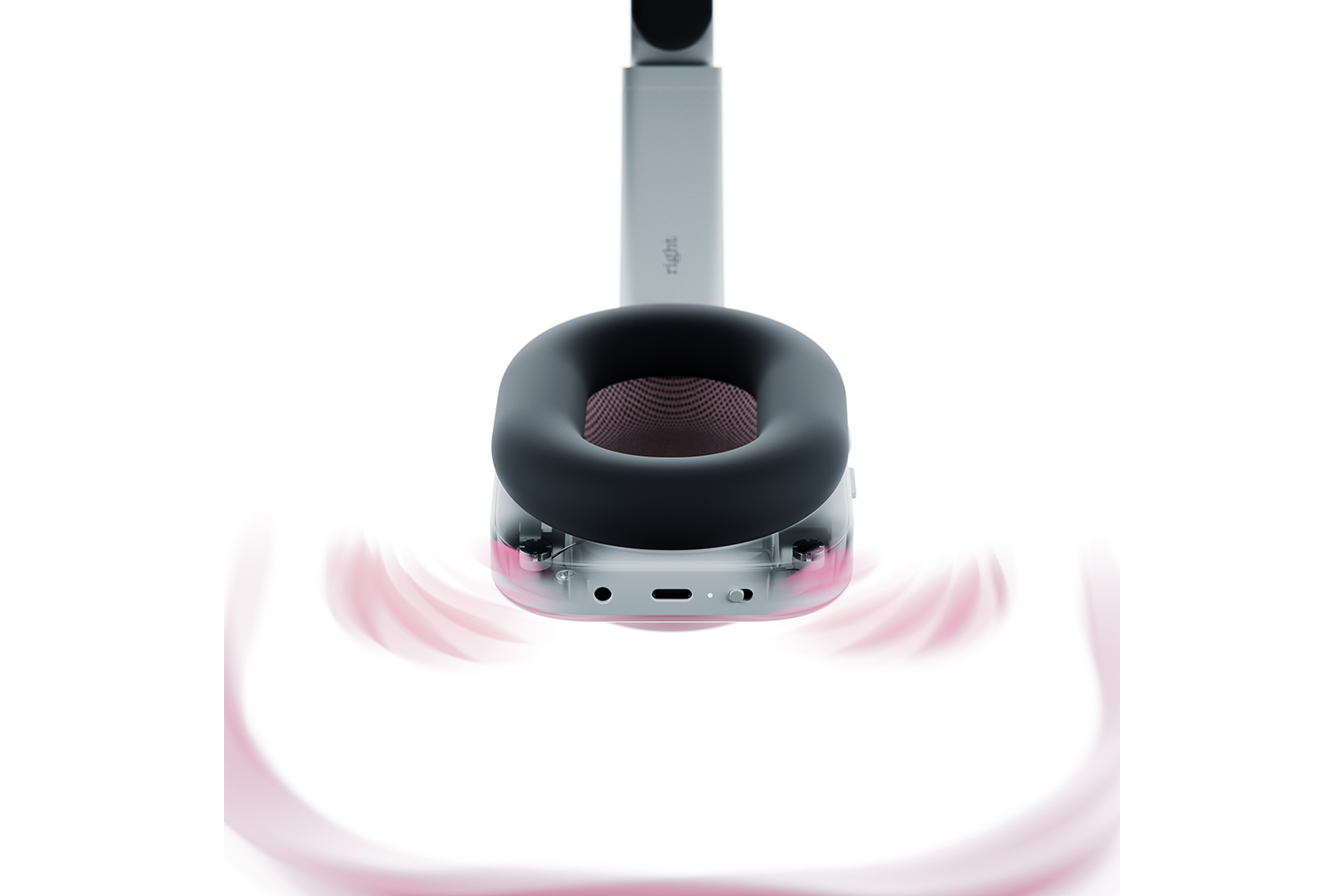 The transparent layered finish on the ear cup shell is achieved through a two-shot moulding process, giving the ear cup shells a high-gloss surface that adds depth and dimensionality to the design without distracting from the form.