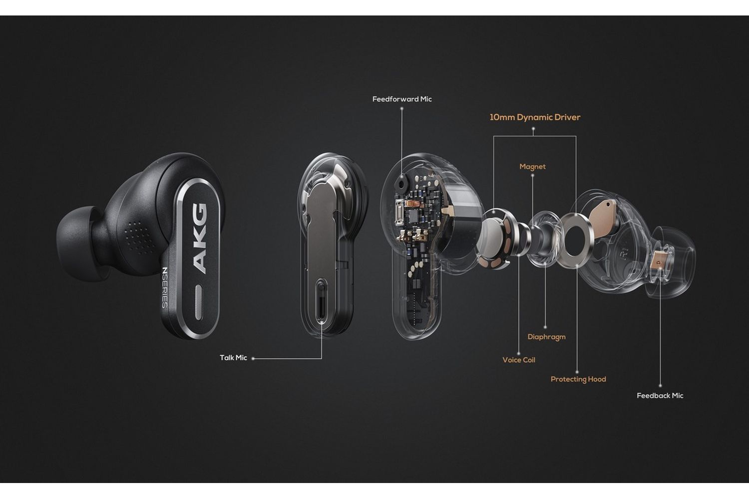 Equipped with 10mm DLC drivers, akg N5 hybrid ANC true wireless offers a powerful spatial sound option, transforming standard stereo content into amorphous surround sound. Top off your battery and these earbuds give a staggering 10 hours of playback time complete with immersive Spatial Sound audio, letting you comfortably transit into the beautiful world of music anytime, anywhere.