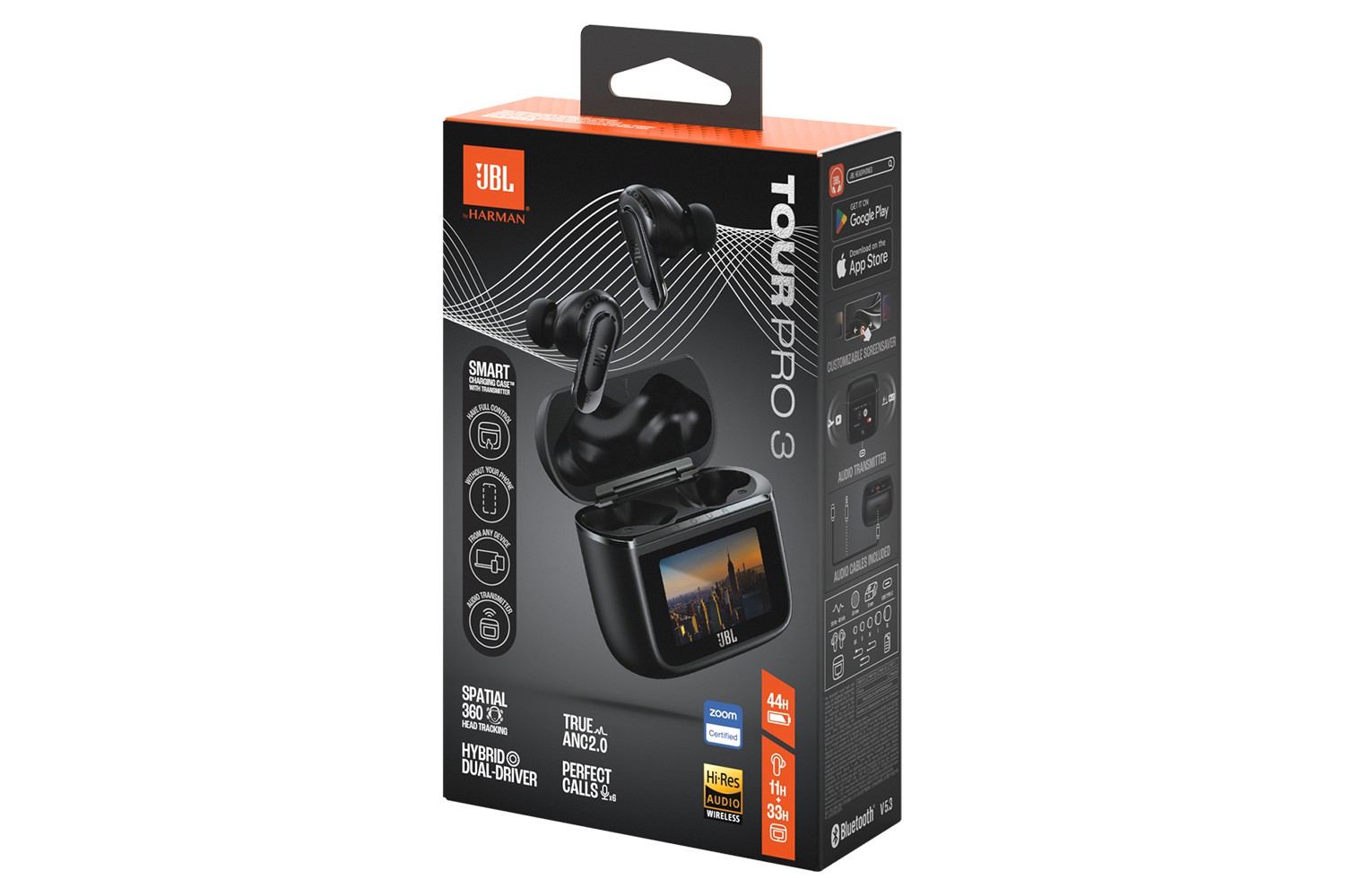 All of the JBL Tour Pro 3's smartest features are also ready for you to use and customize in the free JBL Headphones app. Just download the free JBL Headphones app to customize EQ, switch on Adaptive Noise Cancelling, adjust your ambient sound control settings, check your best fit, or find your earbuds. You can also customize how the earbuds behave through the gesture customization or adapt the sound output to audio or video to get the most out of your content. Plus you can customize the Smart Charging Case display using one of your photos as wallpaper, choosing the screen language, and selecting which features shortcut to make accessible from the case.