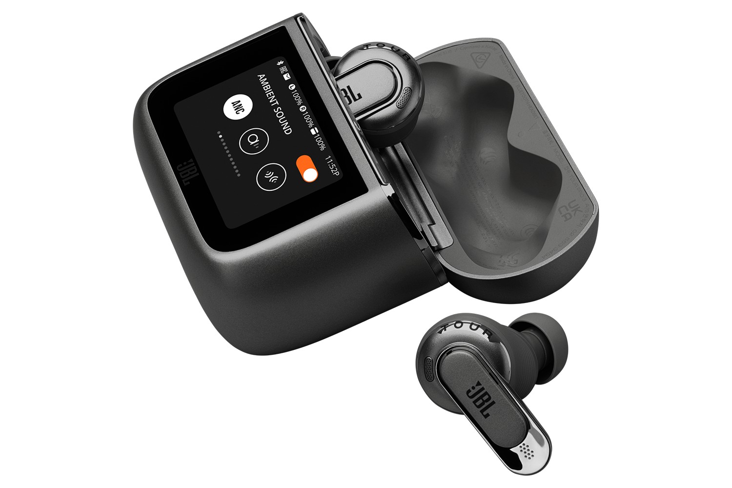Leave your phone in your pocket. JBL Tour Pro 3's newly redesigned Smart Charging Case has all the features you need to fully control and customize your listening experience and the earbuds settings in multiple languages, right from the case. Use the bigger, clearer 1.57" touchscreen to see what song is playing or who's calling you, or personalize the tactile screen with your favorite photo. Check the dynamic lock screen to get info on battery life status, time, messages etc.