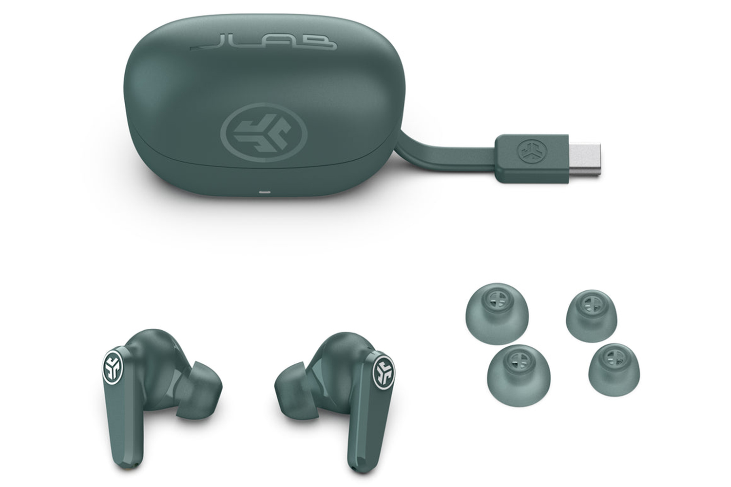 - Charging case w/ integrated USB-C charging cable
