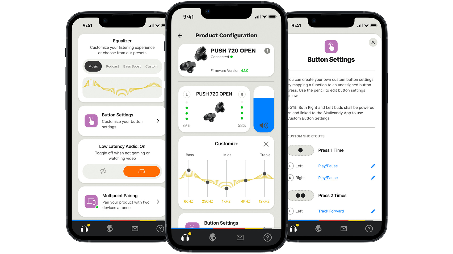 Enhance your listening experience with the Skullcandy App. Customize EQs or choose from presets, configure button settings and trigger a photo from your earbud.