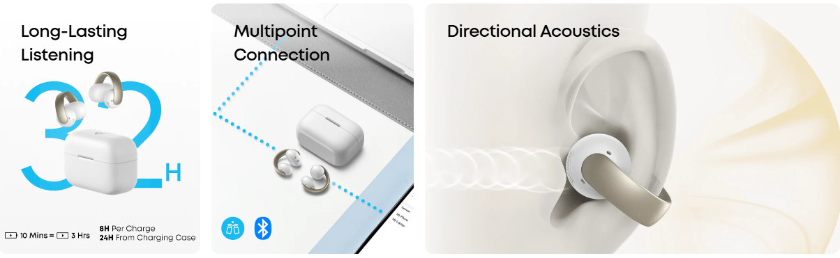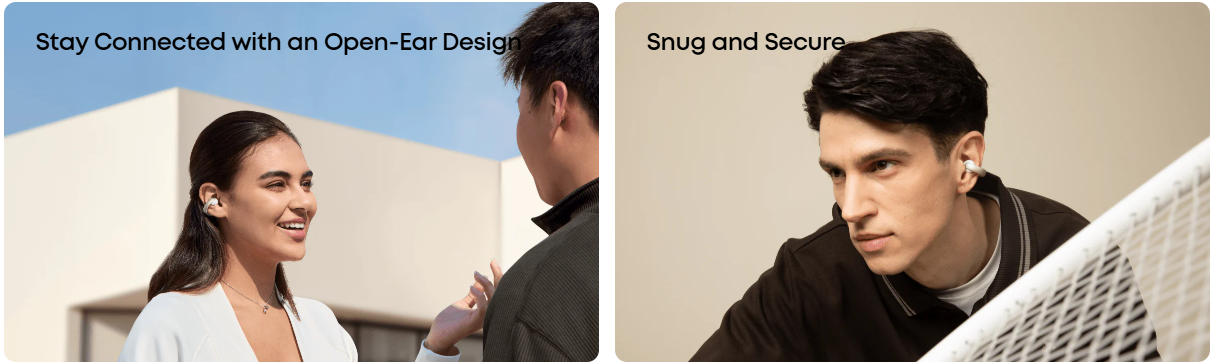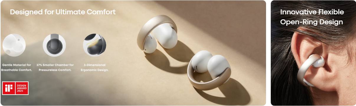 soundcore AeroClip clip-on earbuds boast an adaptive open-ring design that endures 20,000 bends. Feather-light and flexible, they stay secure for all-day wear.