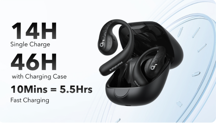 Enjoy 14 hours of play on a single charge, extending to a total of 46 hours with the charging case. Better yet, a quick 10-minute charge delivers an impressive 5.5 hours of nonstop audio.