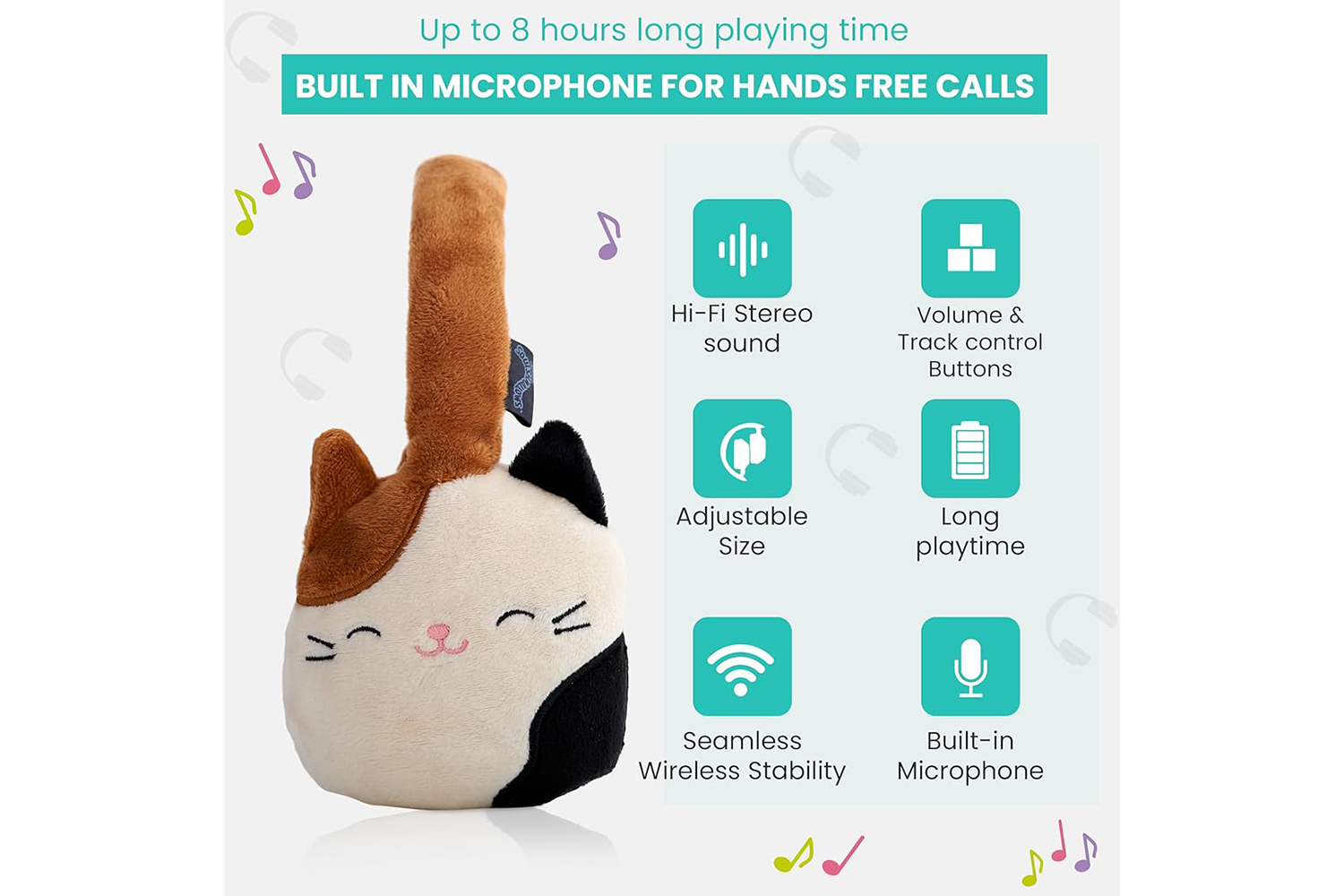 Add to your Squishmallows Squad with these cute, plush, Cam the Cat character headphones! These Official Licensed wireless headphones have a built-in microphone that connects easily to your device using Bluetooth v5.0. and offer up to 10 meters operating distance. You can listen to your favourite music or make and take phone calls with ease using the handy Play/Pause, Volume control, and Previous/Next track buttons which are conveniently situated on the outer side of the adjustable headband. These headphones offer up to an impressive 8 hours continous playback from a single 2 hour charge, and have a standby time of up to 200 hours. Other Squishmallows character headphones are available.