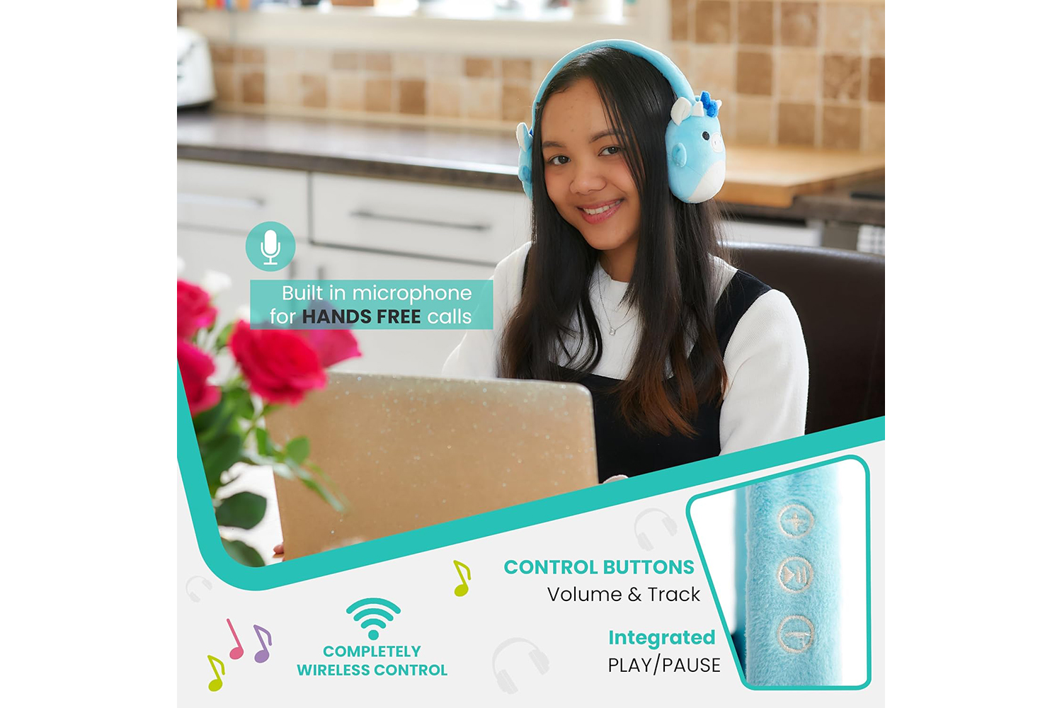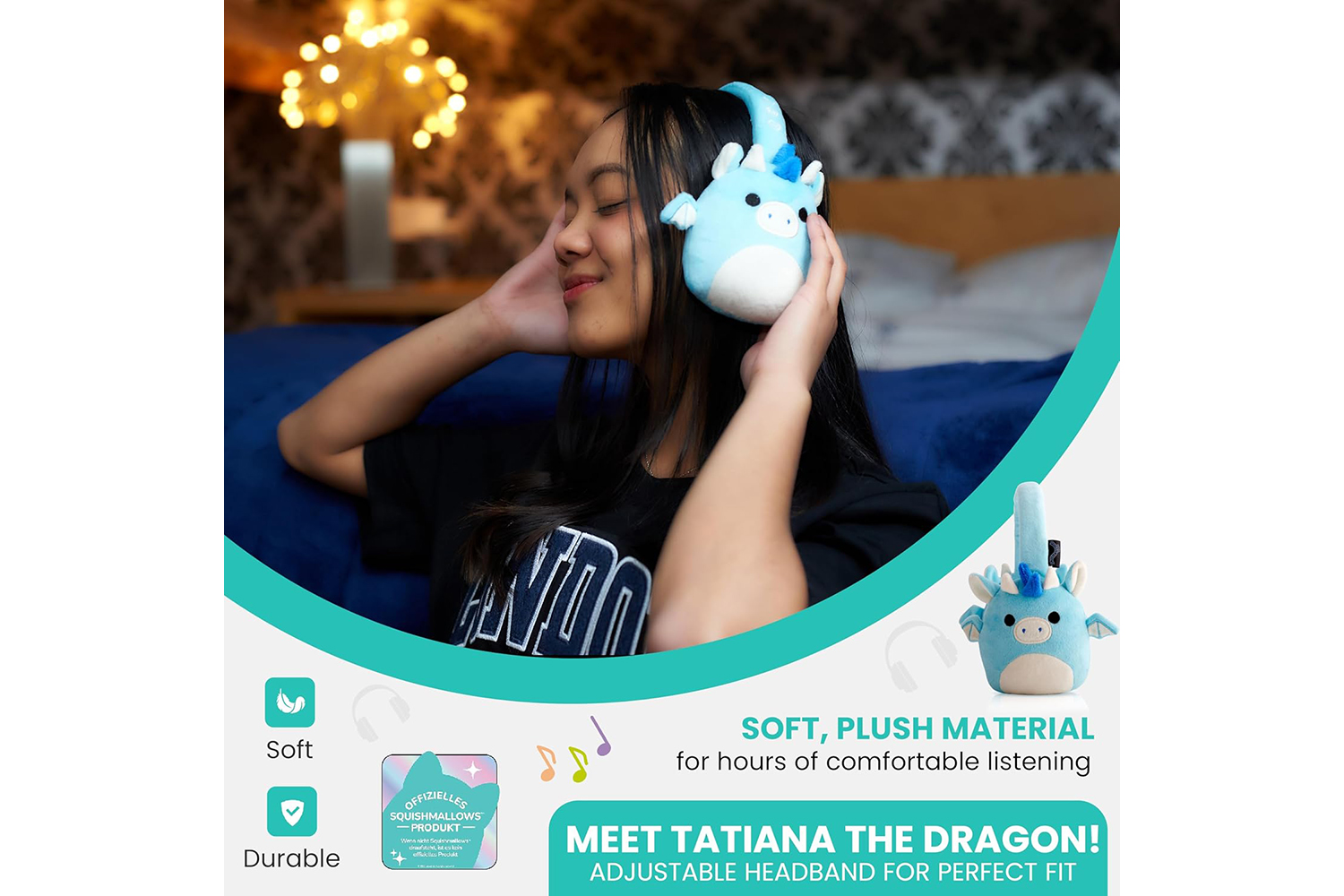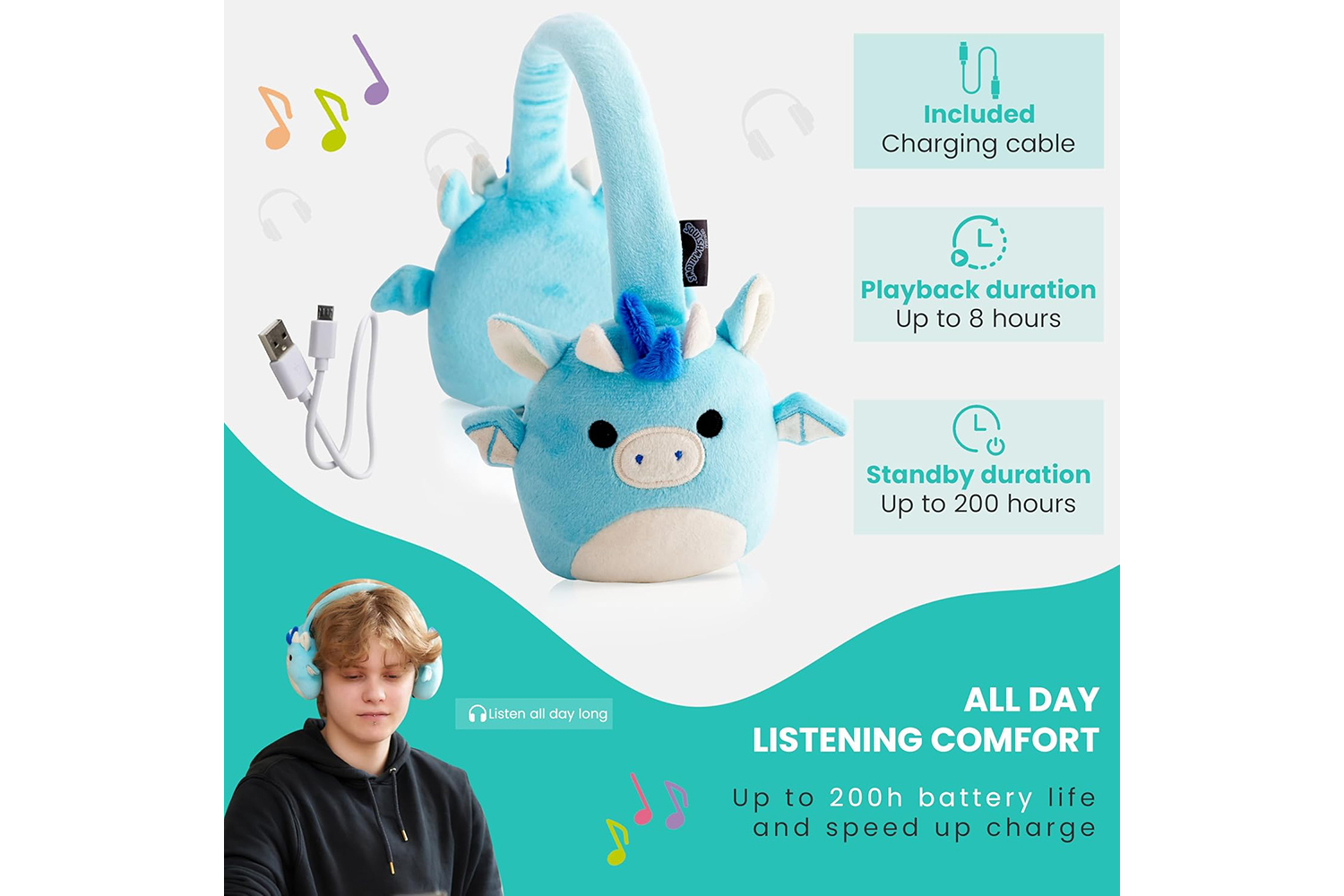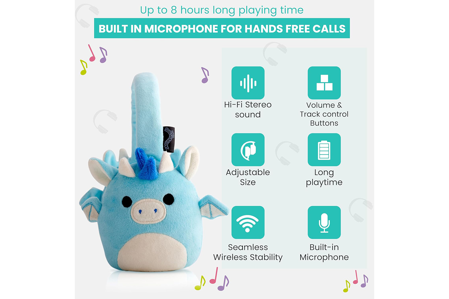 Add to your Squishmallows Squad with these cute, plush, Tatiana The Dragon character headphones! These Official Licensed wireless headphones have a built-in microphone that connects easily to your device using Bluetooth v5.0. and offer up to 10 meters operating distance. You can listen to your favourite music or make and take phone calls with ease using the handy Play/Pause, Volume control, and Previous/Next track buttons which are conveniently situated on the outer side of the adjustable headband. A micro USB charging cable is also included. These headphones offer up to an impressive 8 hours continous playback from a single 2 hour charge, and have a standby time of up to 200 hours. Other Squishmallows character headphones are available.