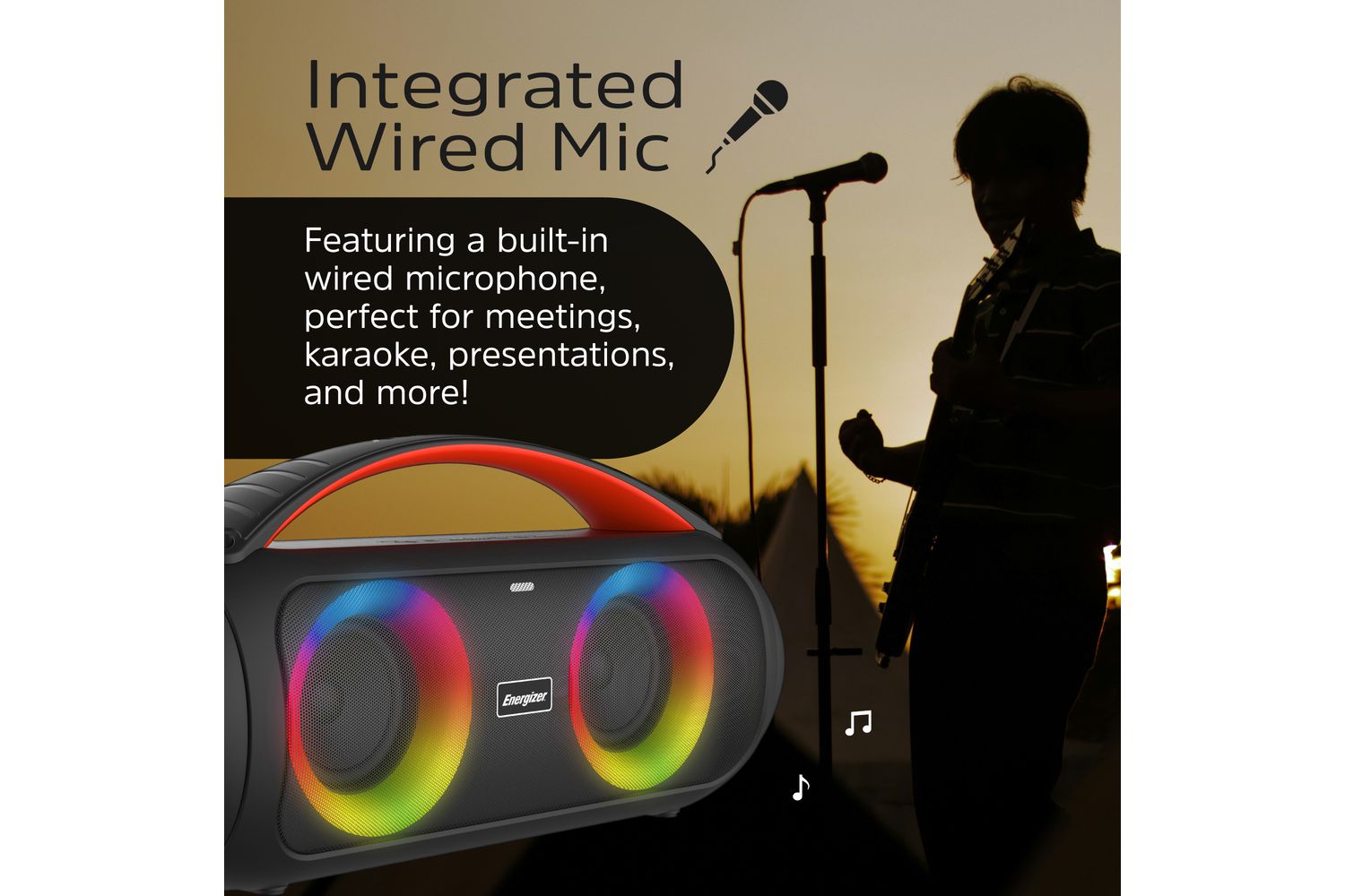 - Built-in microphone and included wired mic for karaoke and calls