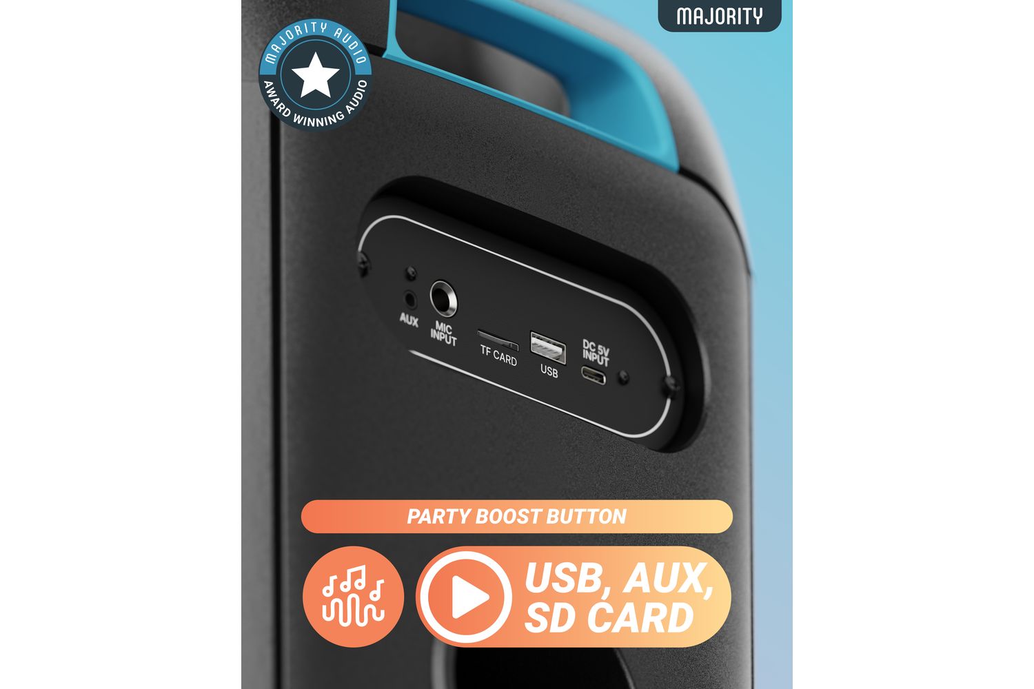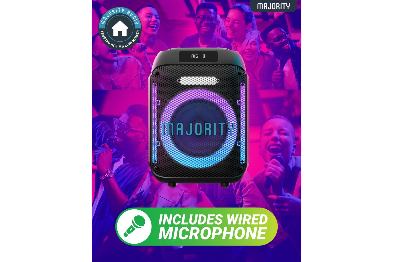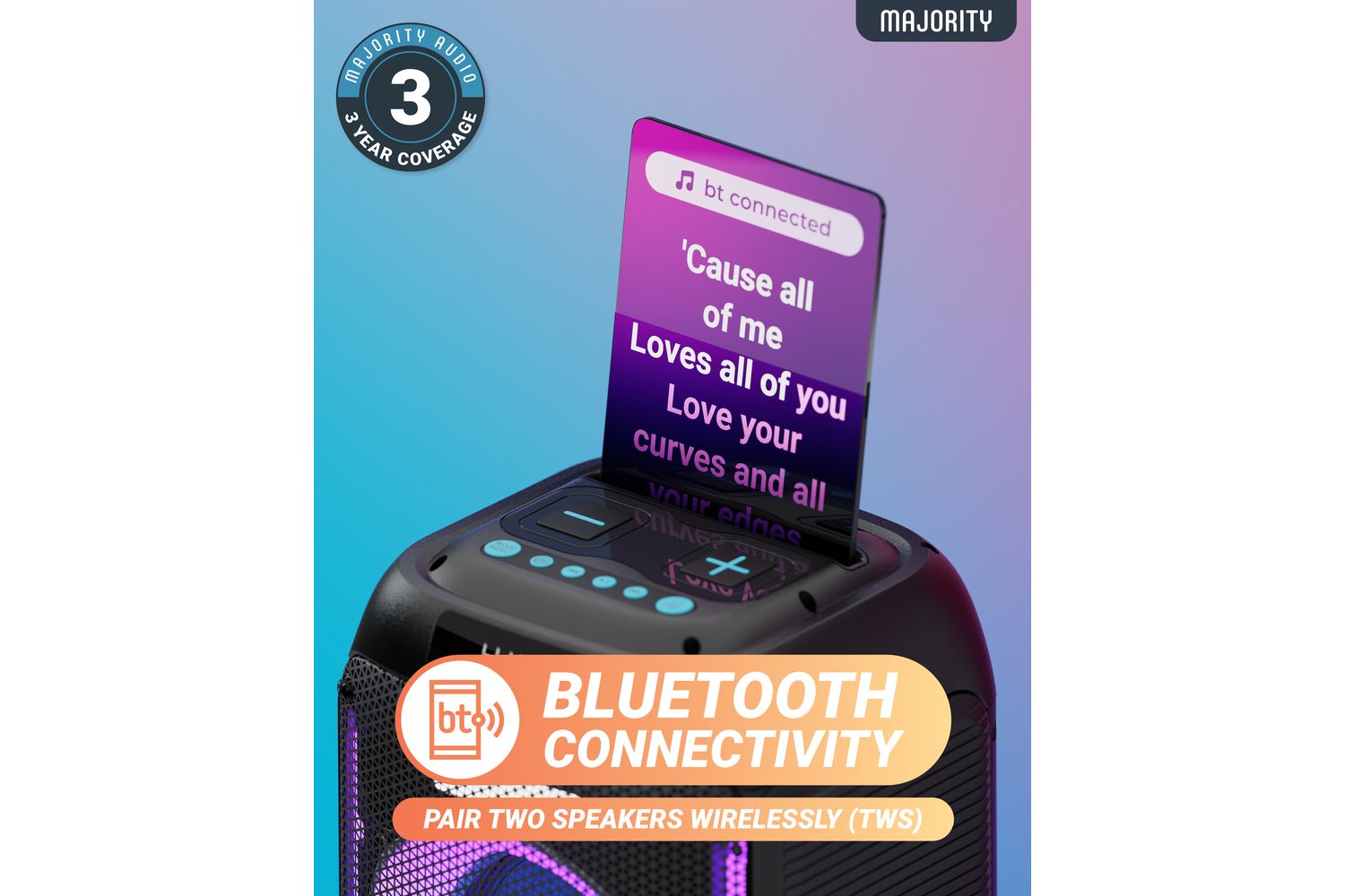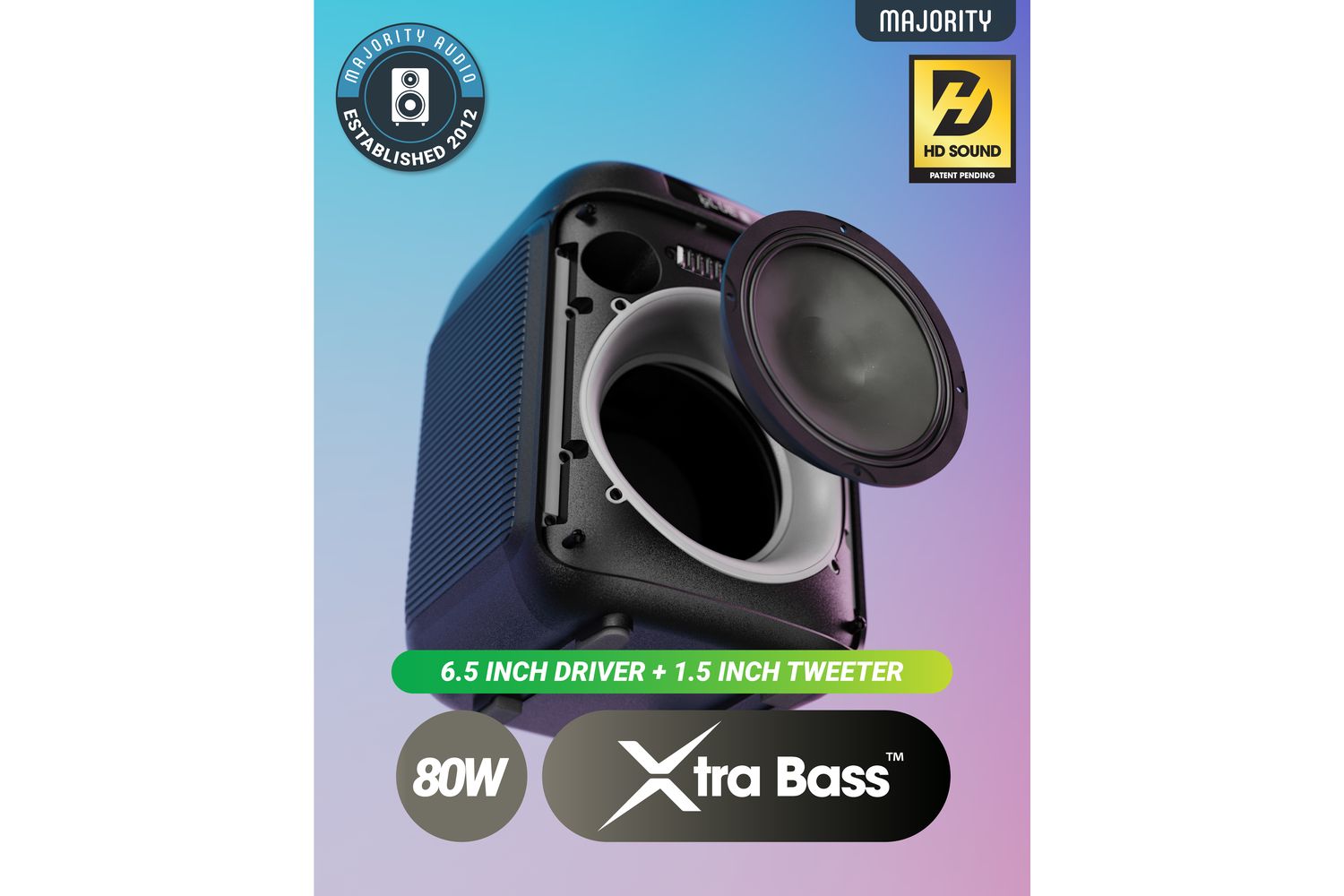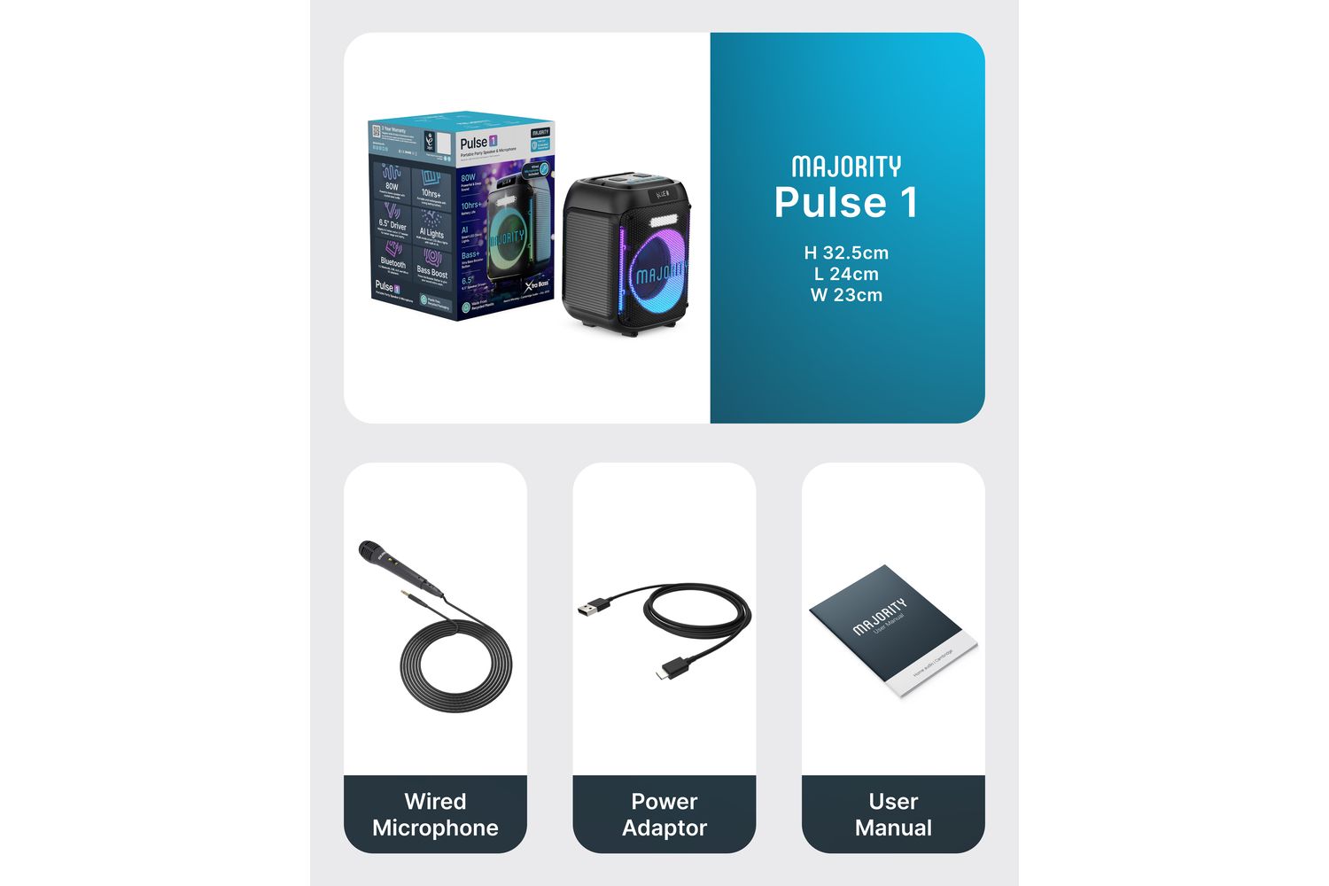 The Pulse 1 Party Speaker packs 80W of powerful sound, a 6.5" bass driver, Bluetooth, TWS pairing, USB/AUX/SD playback, and smart AI lights. It’s portable, rechargeable (10 hrs), and includes a wired microphone – perfect for parties and karaoke.