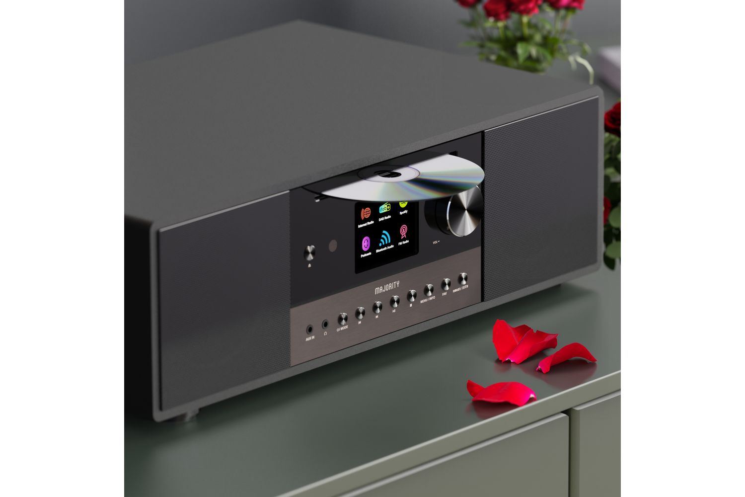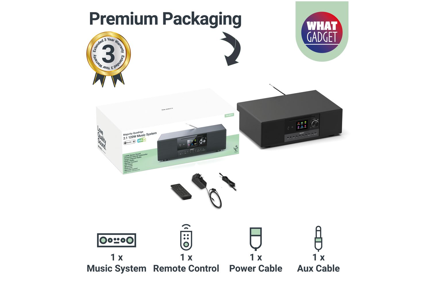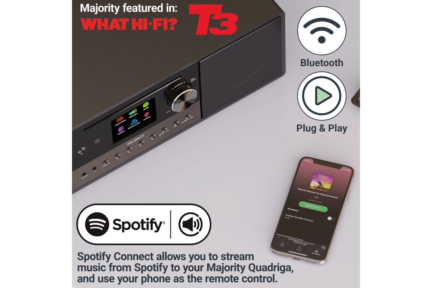 The Majority Quadriga is a versatile music system with DAB+/FM, internet radio, CD player, Bluetooth, and Spotify Connect. It features powerful 120W 2.1 speakers and a vibrant display, delivering rich sound and easy control with the addition of UNDOK and OKTIV App connectivity.