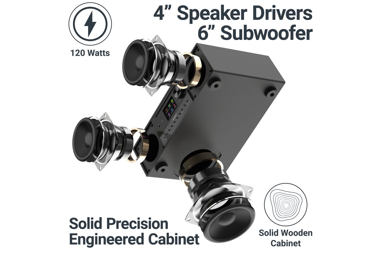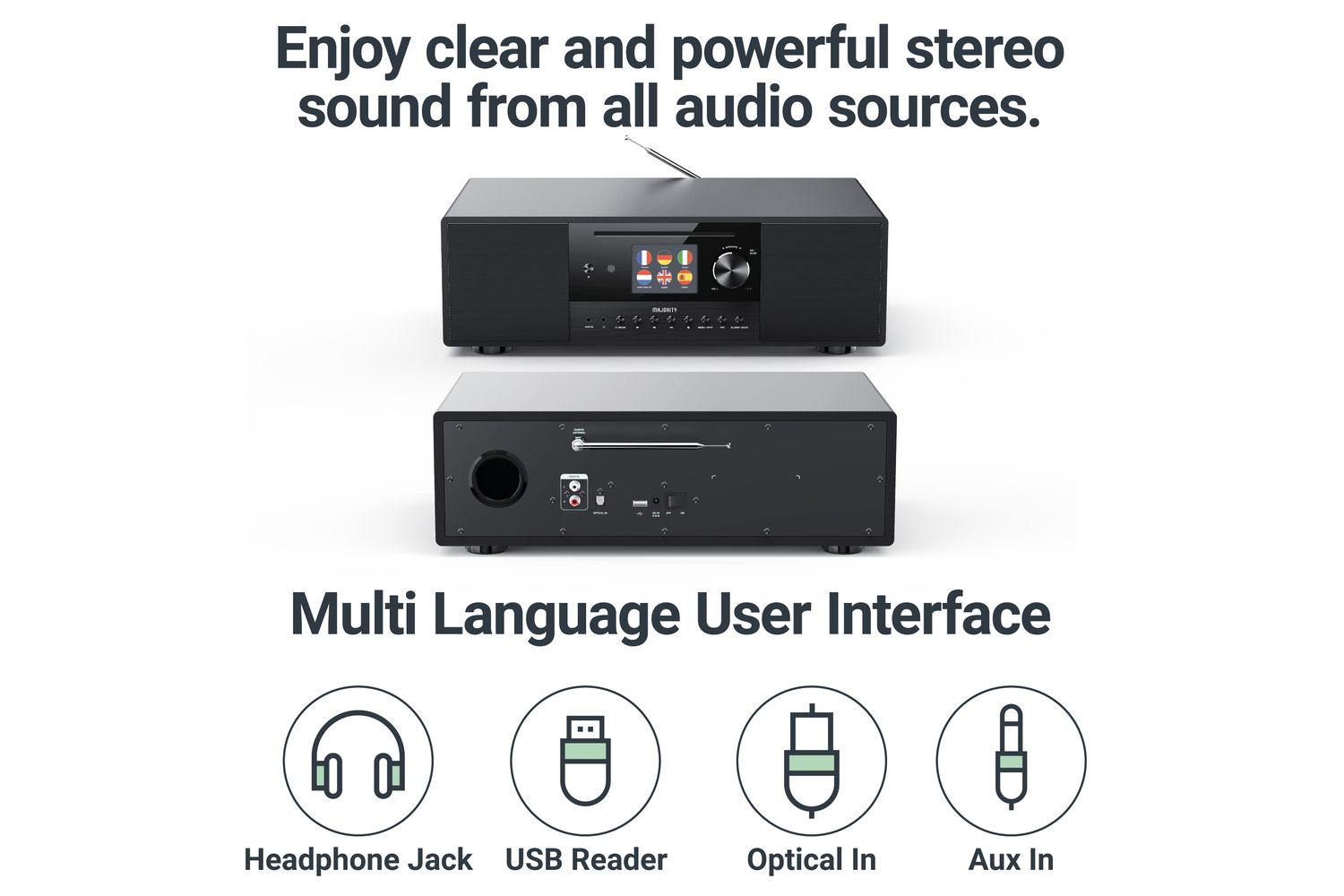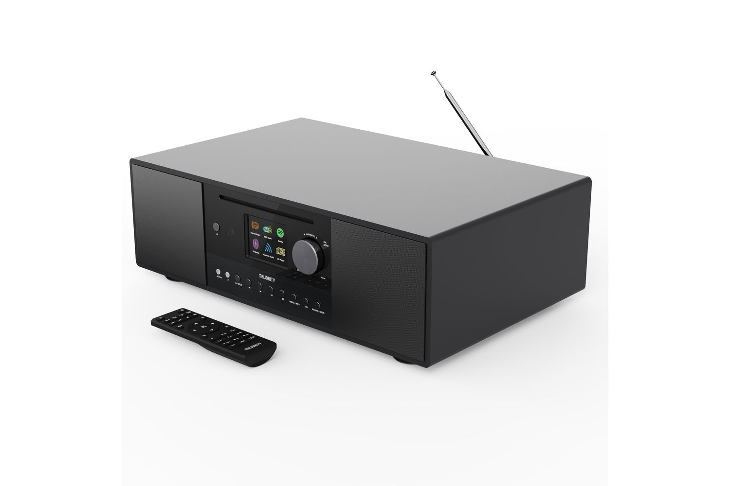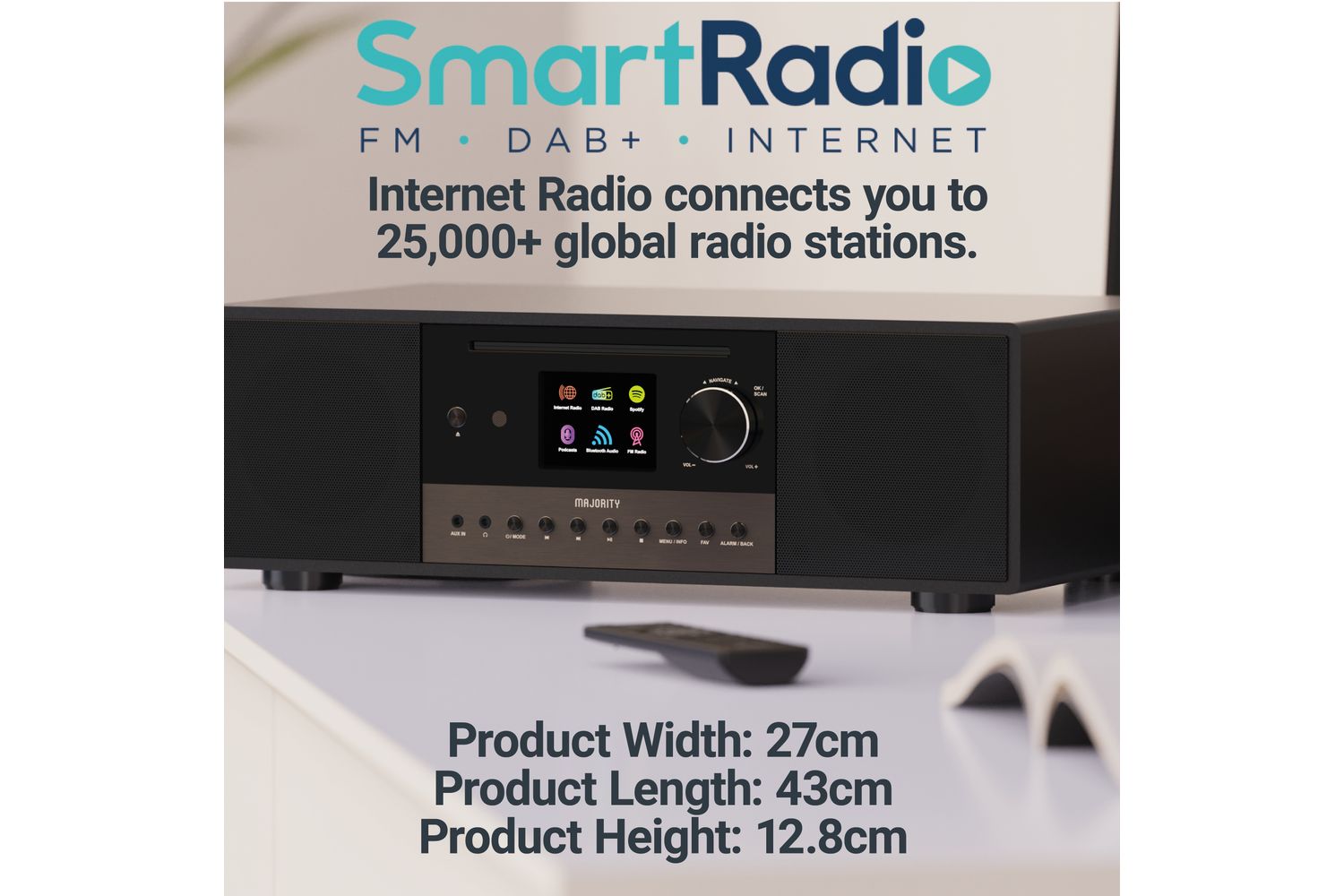 The Majority Quadriga is a versatile music system with DAB+/FM, internet radio, CD player, Bluetooth, and Spotify Connect. It features powerful 120W 2.1 speakers and a vibrant display, delivering rich sound and easy control with the addition of UNDOK and OKTIV App connectivity.